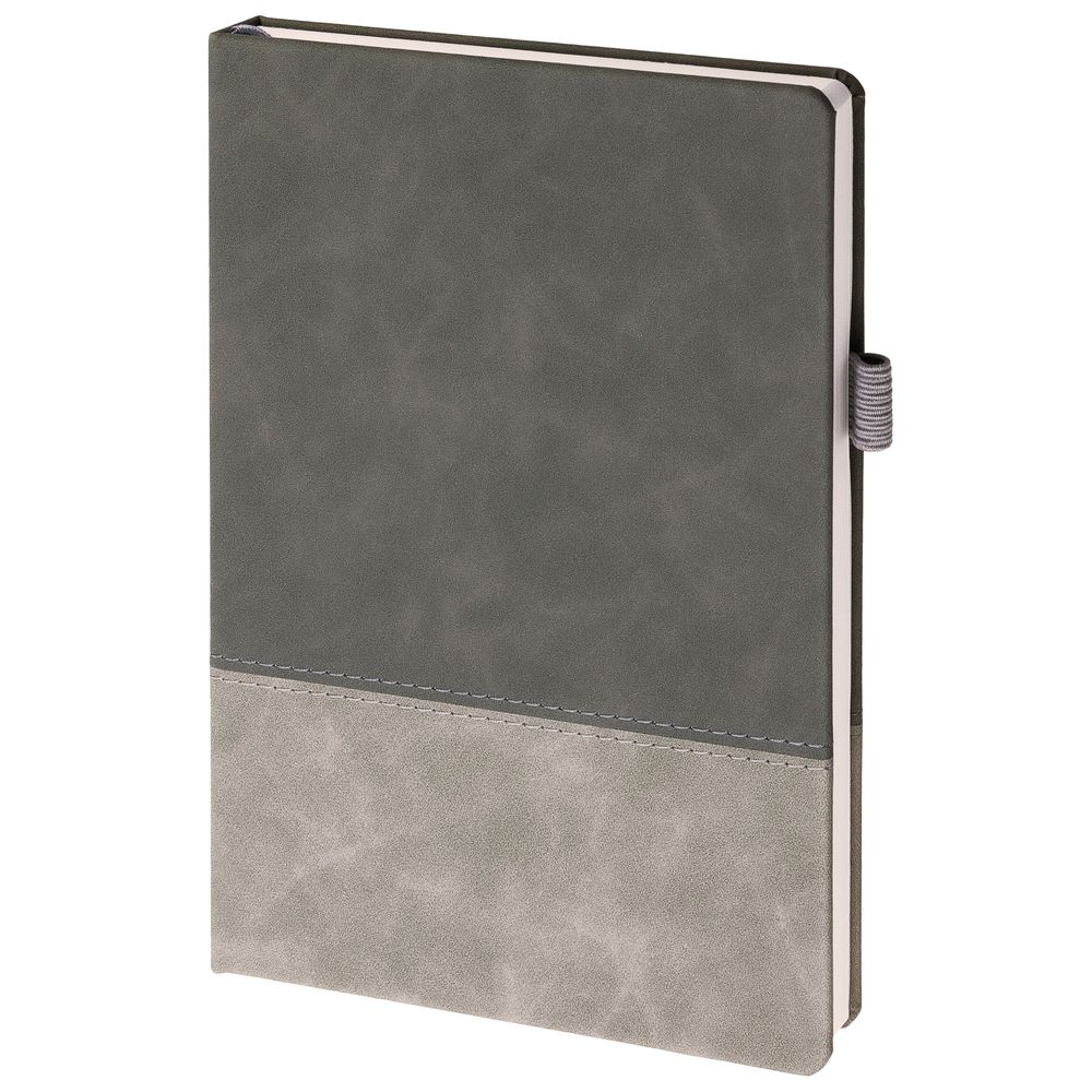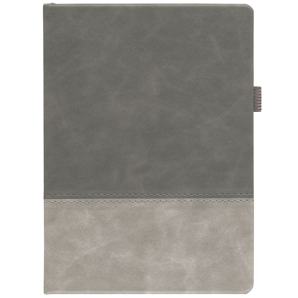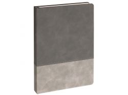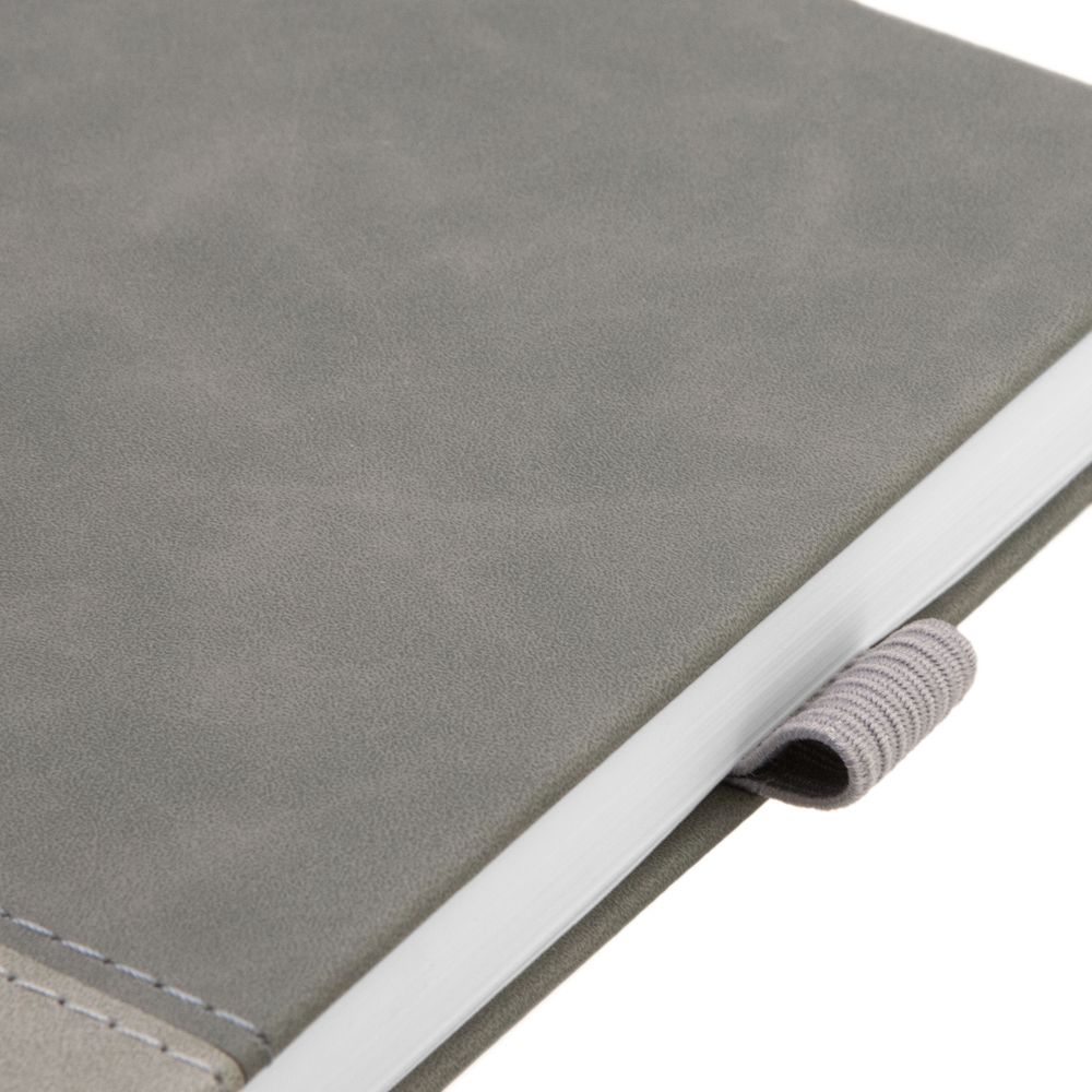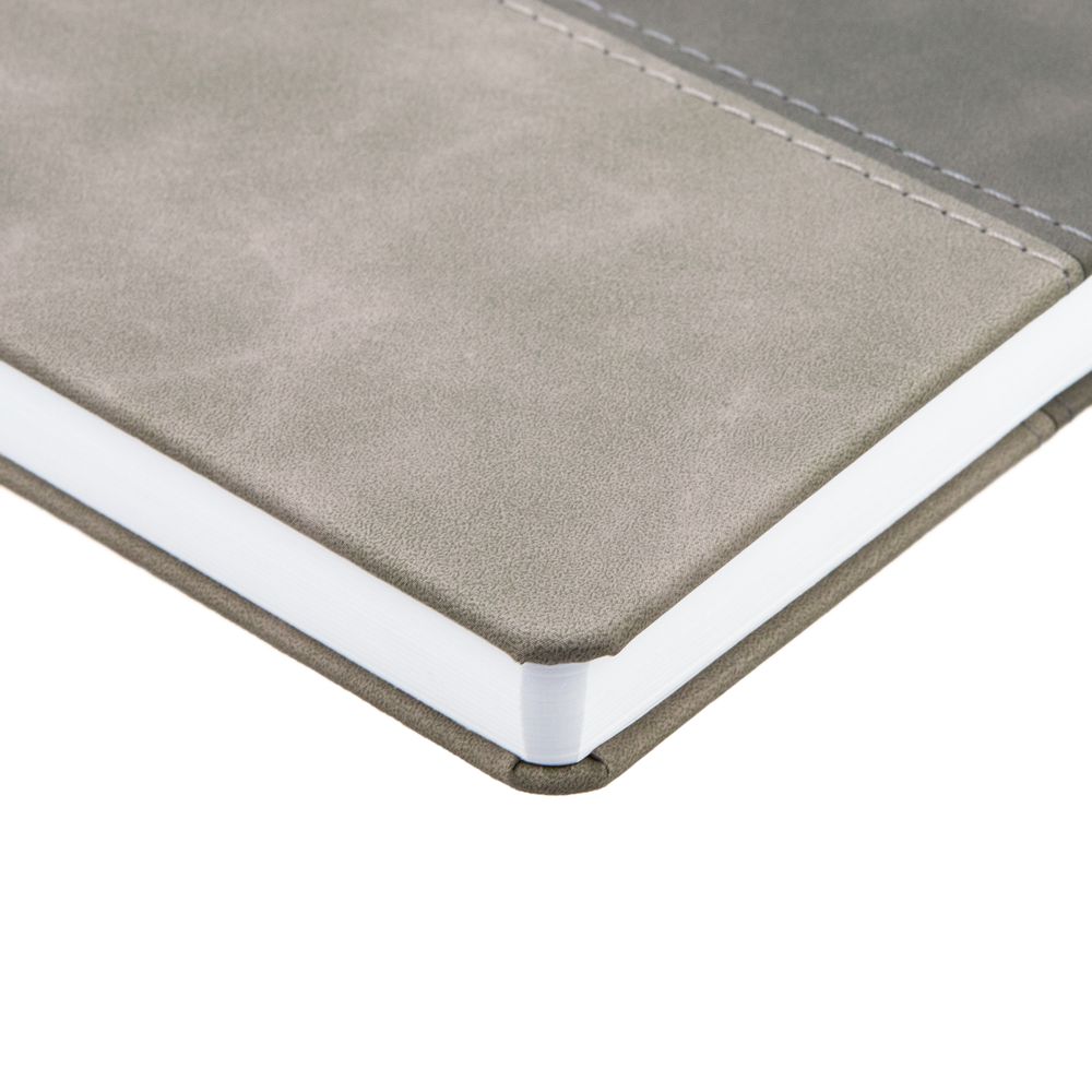 Ежедневник с твердой обложкой, без поролона, со сшивкой материалов Nubuck Touch серый СС, и Nubuck Touch тёмно-серый ЕЕ., дополнен двойным ляссе и петлей-резинкой для ручки.Блок 985, без календарной сетки и информационного блока:Кол-во страниц — 256;Бумага — белая, плотность 70 г/м²;Форзац и нахзац — белые.
