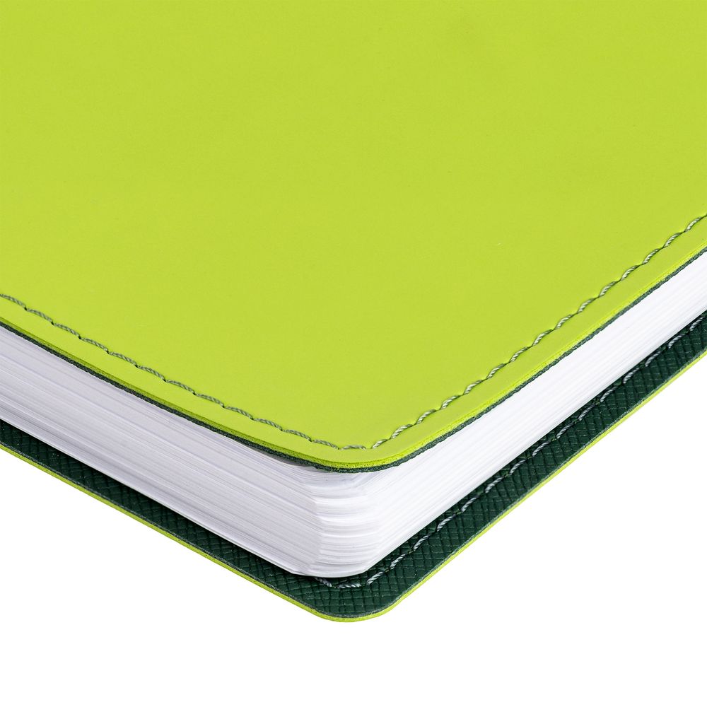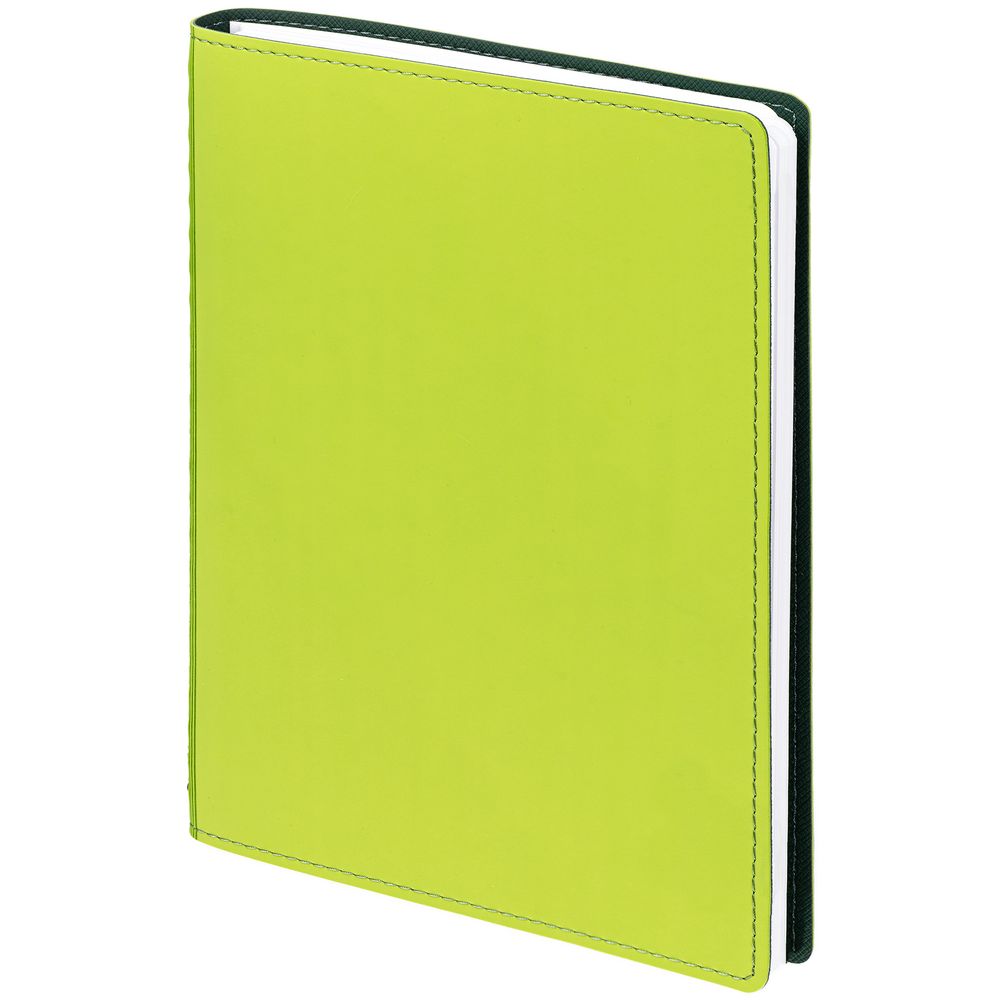 Ежедневник с гибкой обложкой, выполнен из материалов Soft Touch, светло-зеленый YY и Nice Touch, зеленый FF.Блок 206, без календарной сетки и информационного блока: Кол-во страниц — 256;Бумага — белая, плотность 70 г/м².