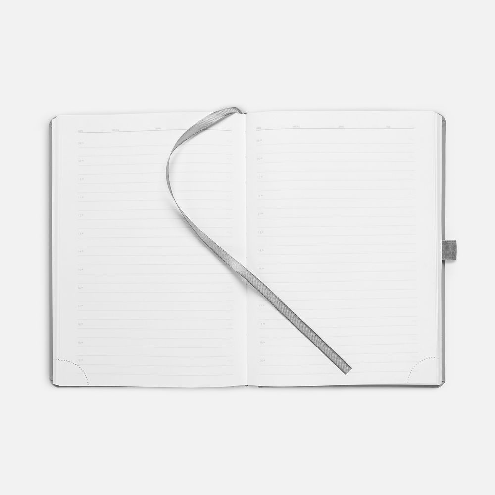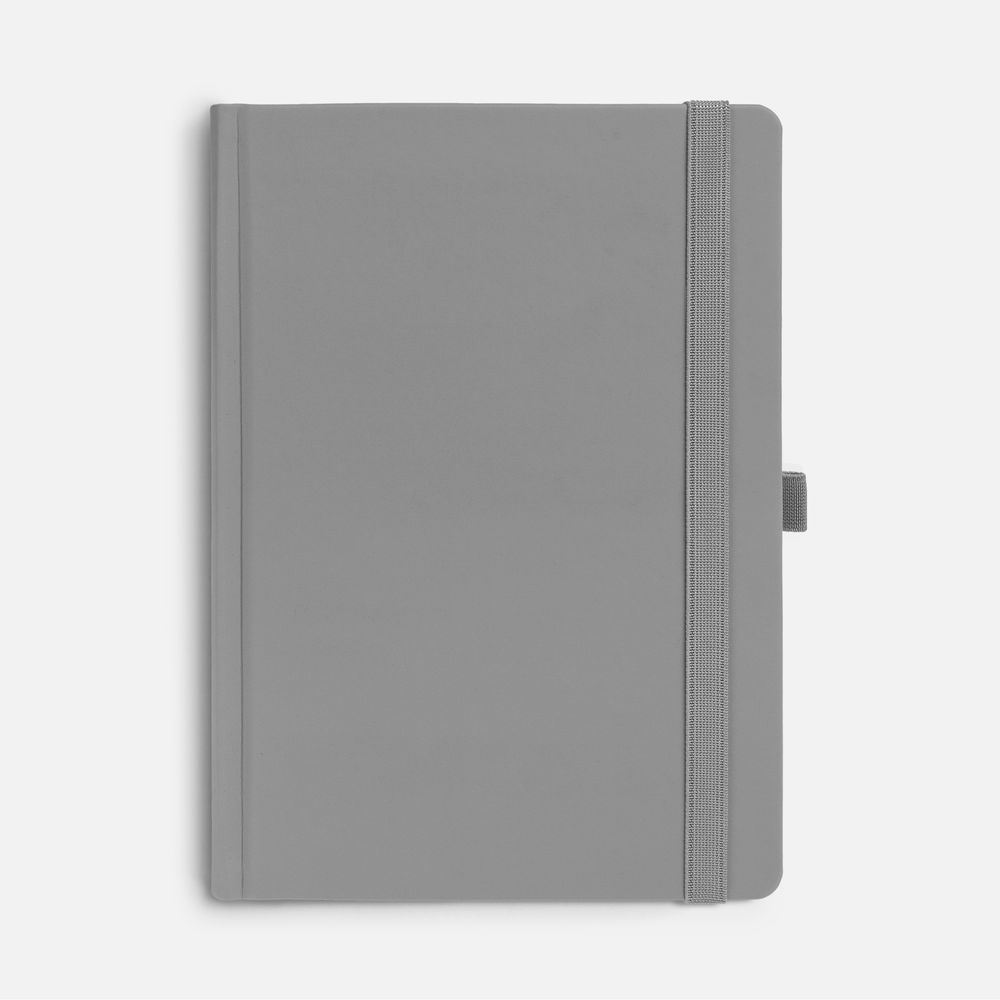 Ежедневник с твердой обложкой без поролона, выполнен из материала Soft Touch, серый СС, дополнен резинкой шириной 1 см, петлей-резинкой для ручки, капталом и ляссе серого цвета.Блок 922, с информационным блоком:Кол-во страниц — 336;Бумага — белая, плотность 70 г/м²;Форзац и нахзац — белого цвета.
