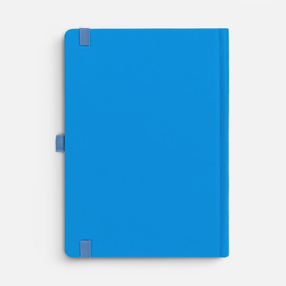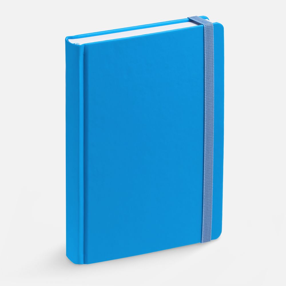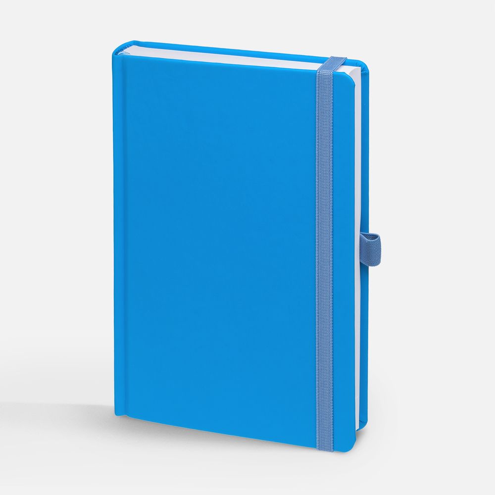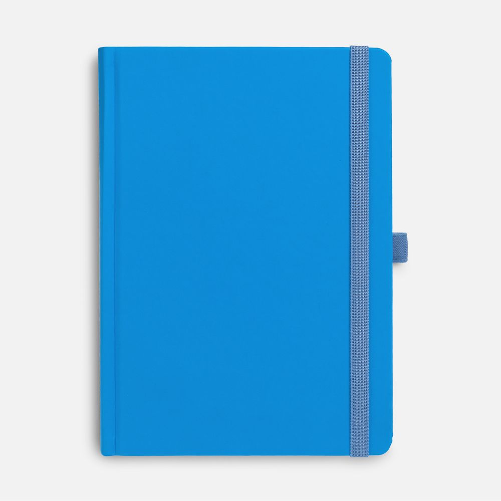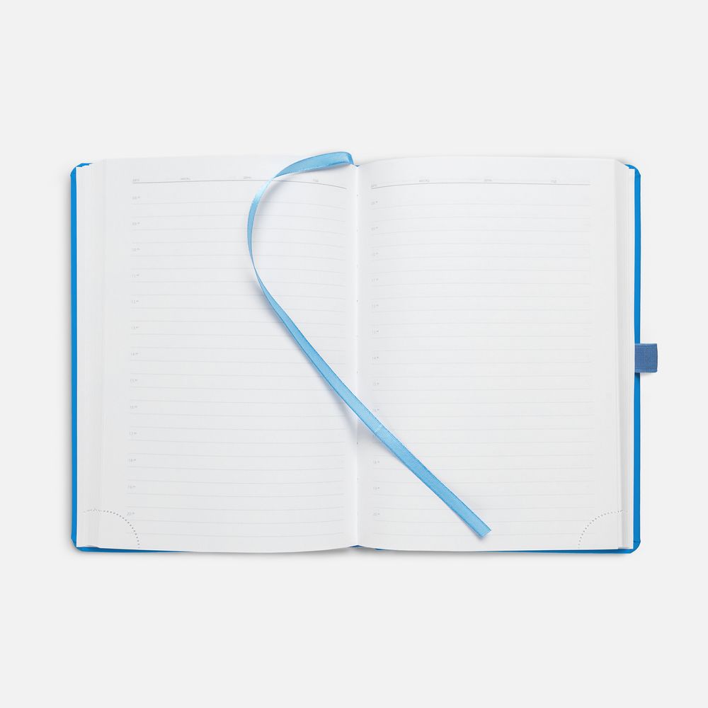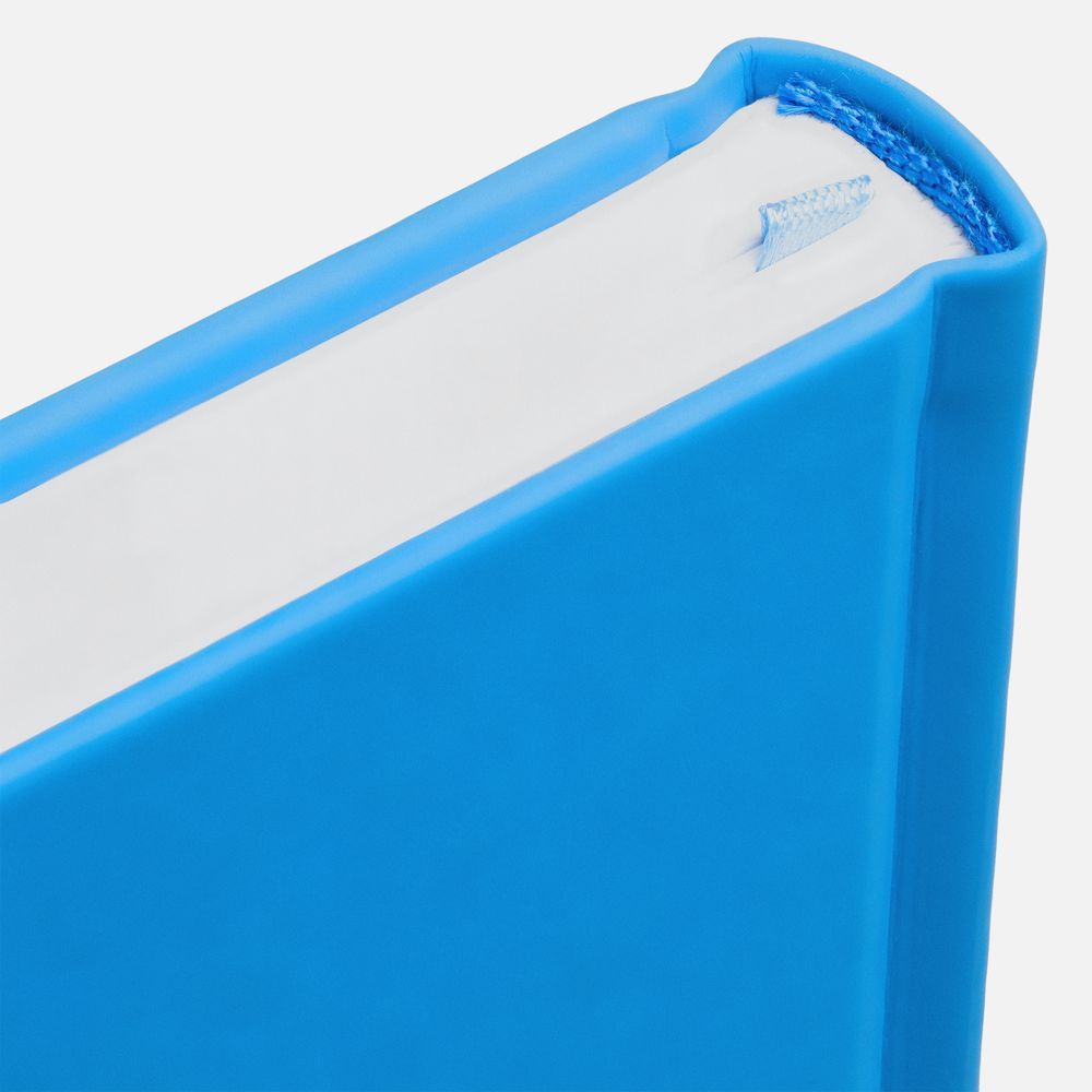 Ежедневник с твердой обложкой без поролона, выполнен из материала Soft Touch Ultra, голубой JJ, дополнен резинкой шириной 1 см, петлей-резинкой для ручки, капталом и ляссе голубого цвета.Блок 922, с информационным блоком:Кол-во страниц — 336;Бумага — белая, плотность 70 г/м²;Форзац и нахзац — белого цвета.