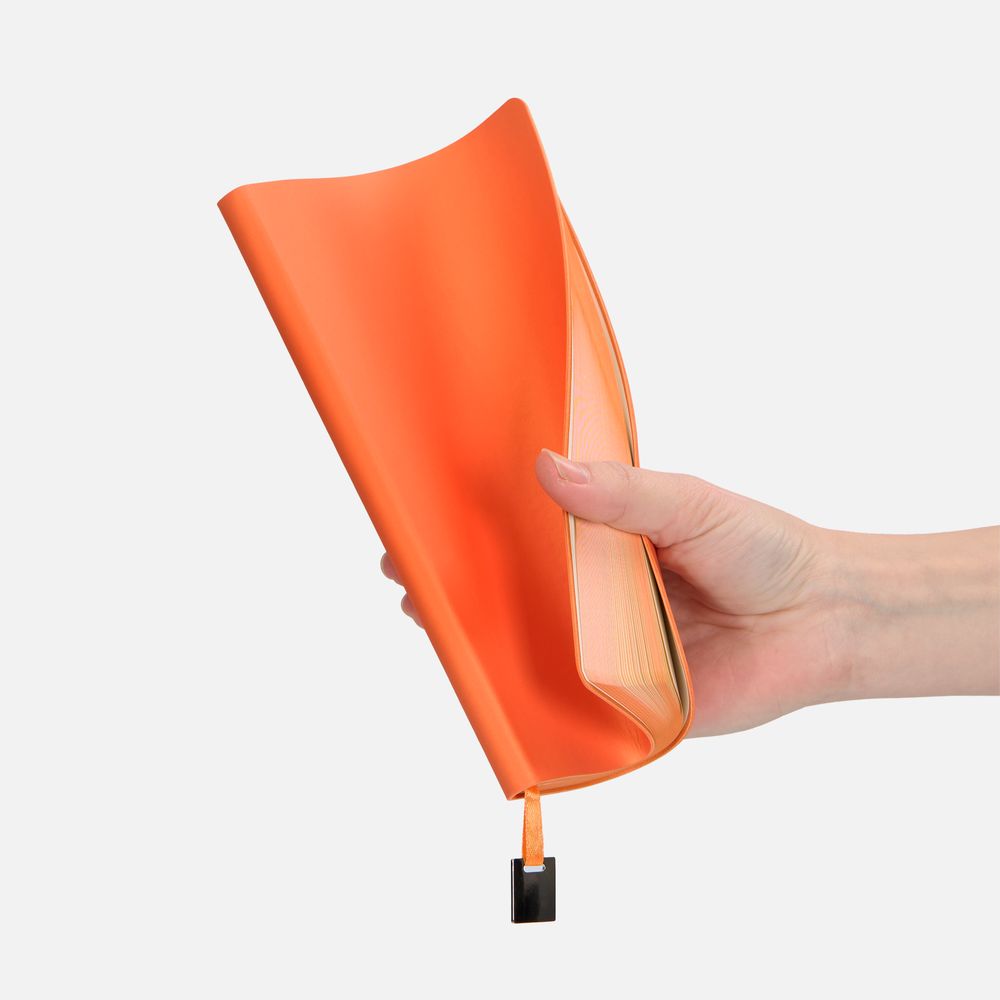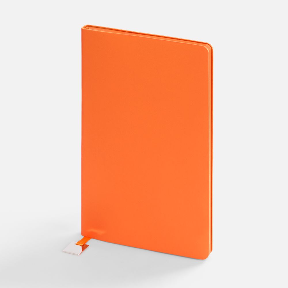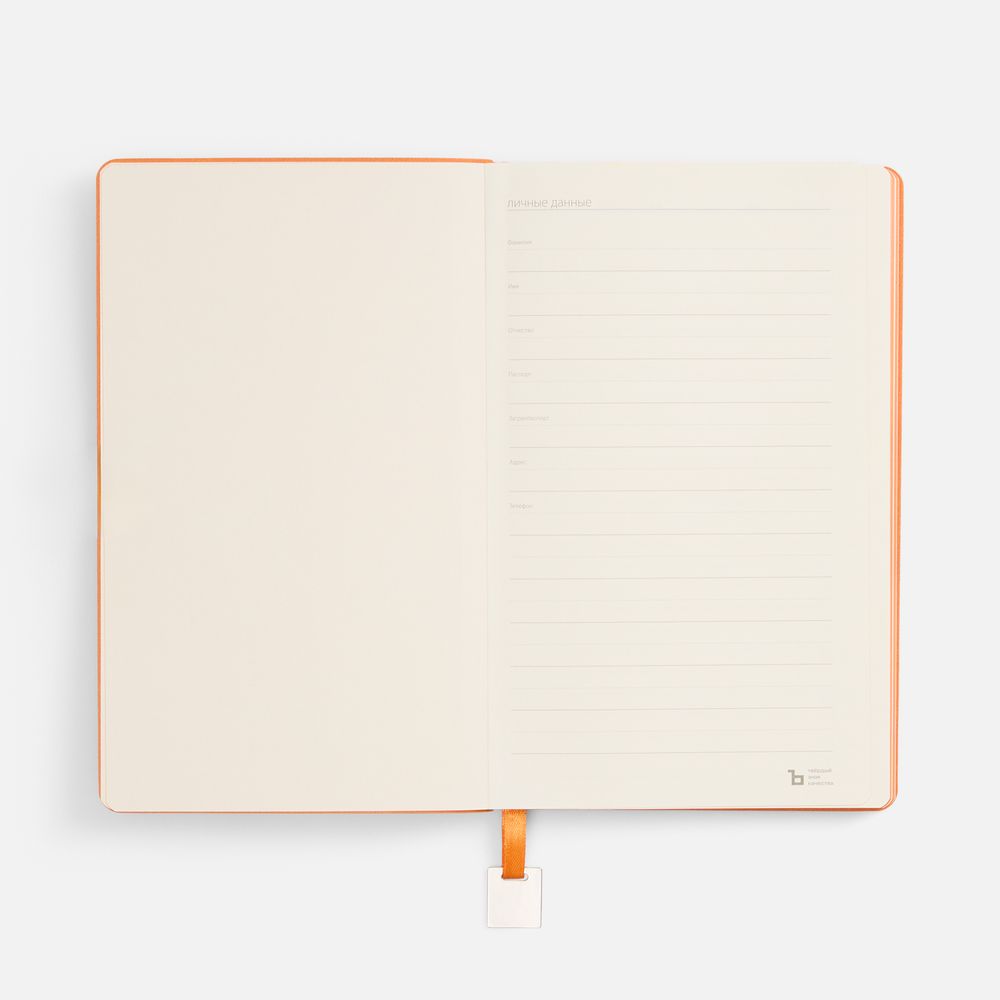 Ежедневник с гибкой обложкой, выполнен из материалов Soft Touch Pearl, оранжевый ОО, и Latte, оранжевый (внутренняя часть обложки), дополнен ляссе в цвет обложки с металлическим шильдиком.Блок без календарной сетки и информационного блока:Кол-во страниц — 192;Бумага — тонированная, плотность 80 г/м²;Обрез — оранжевый;Форзац и нахзац — тонированные.