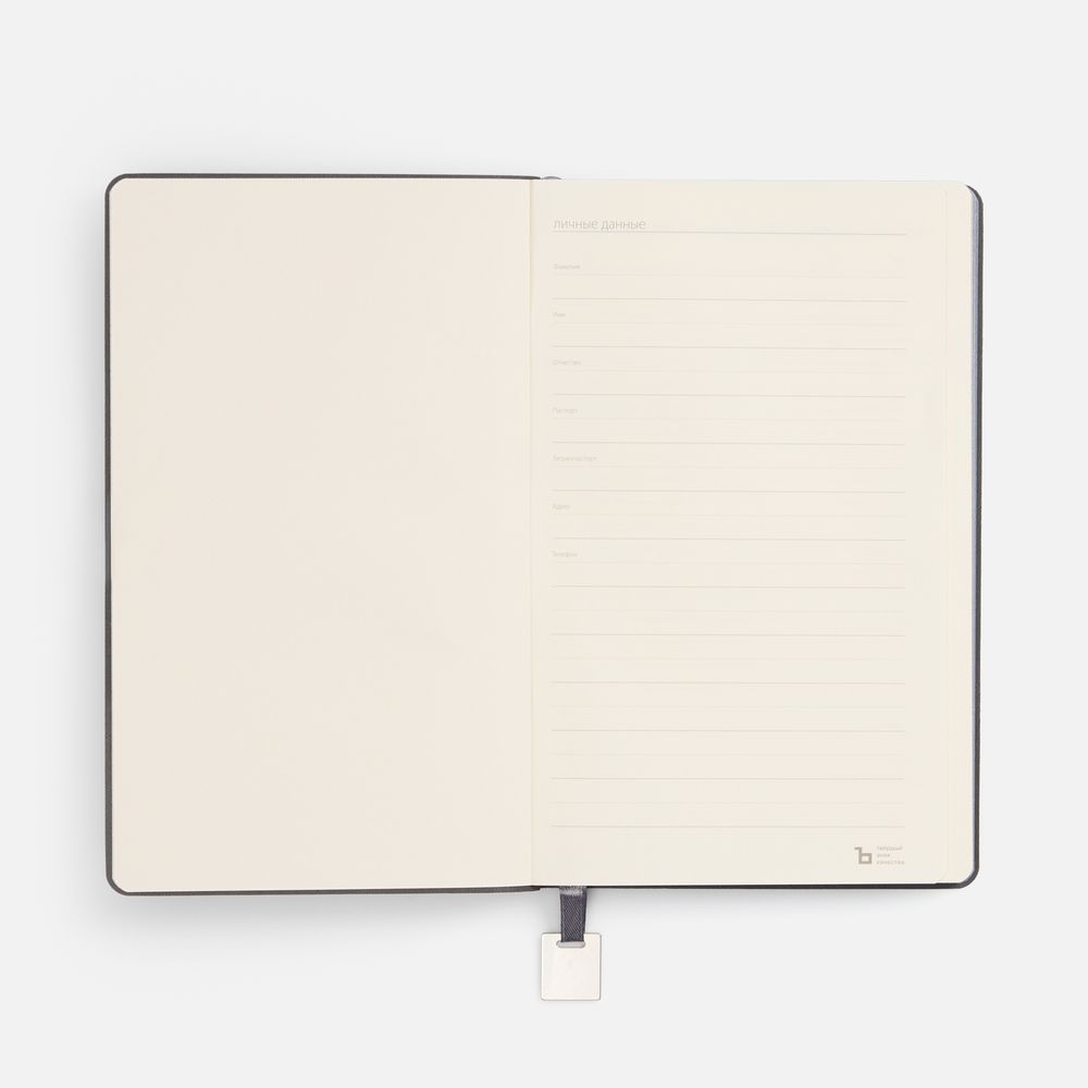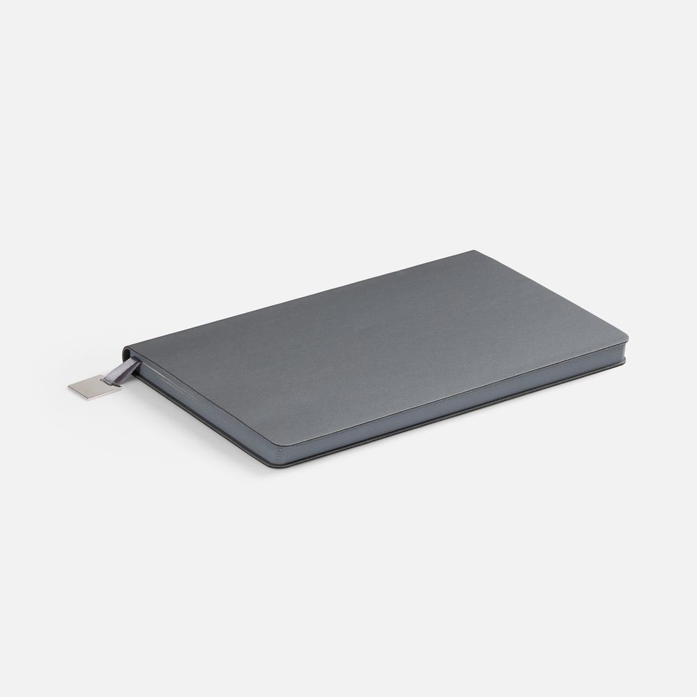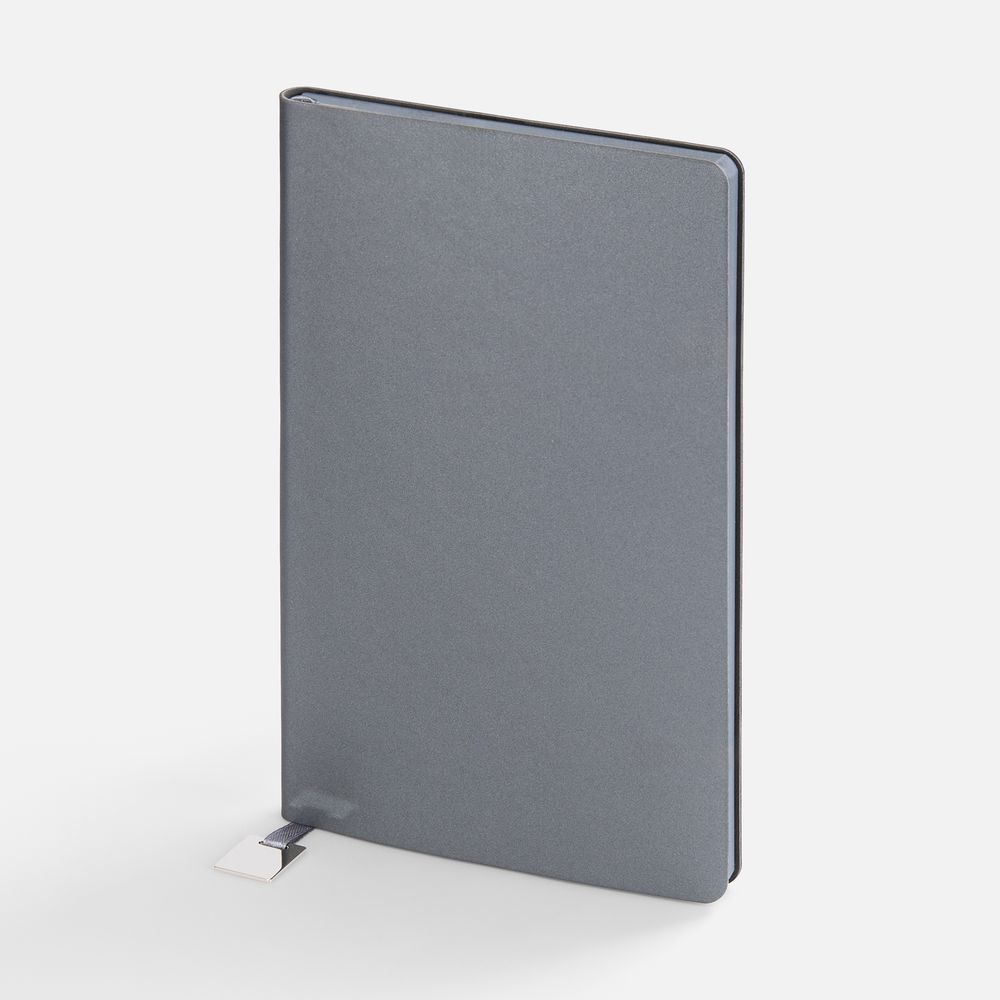 Ежедневник с гибкой обложкой, выполнен из материалов Soft Touch Pearl, серый СС, и Latte, серый (внутренняя часть обложки), дополнен ляссе в цвет обложки с металлическим шильдиком.Блок без календарной сетки и информационного блока:Кол-во страниц — 192;Бумага — тонированная, плотность 80 г/м²;Обрез — серый;Форзац и нахзац — тонированные.