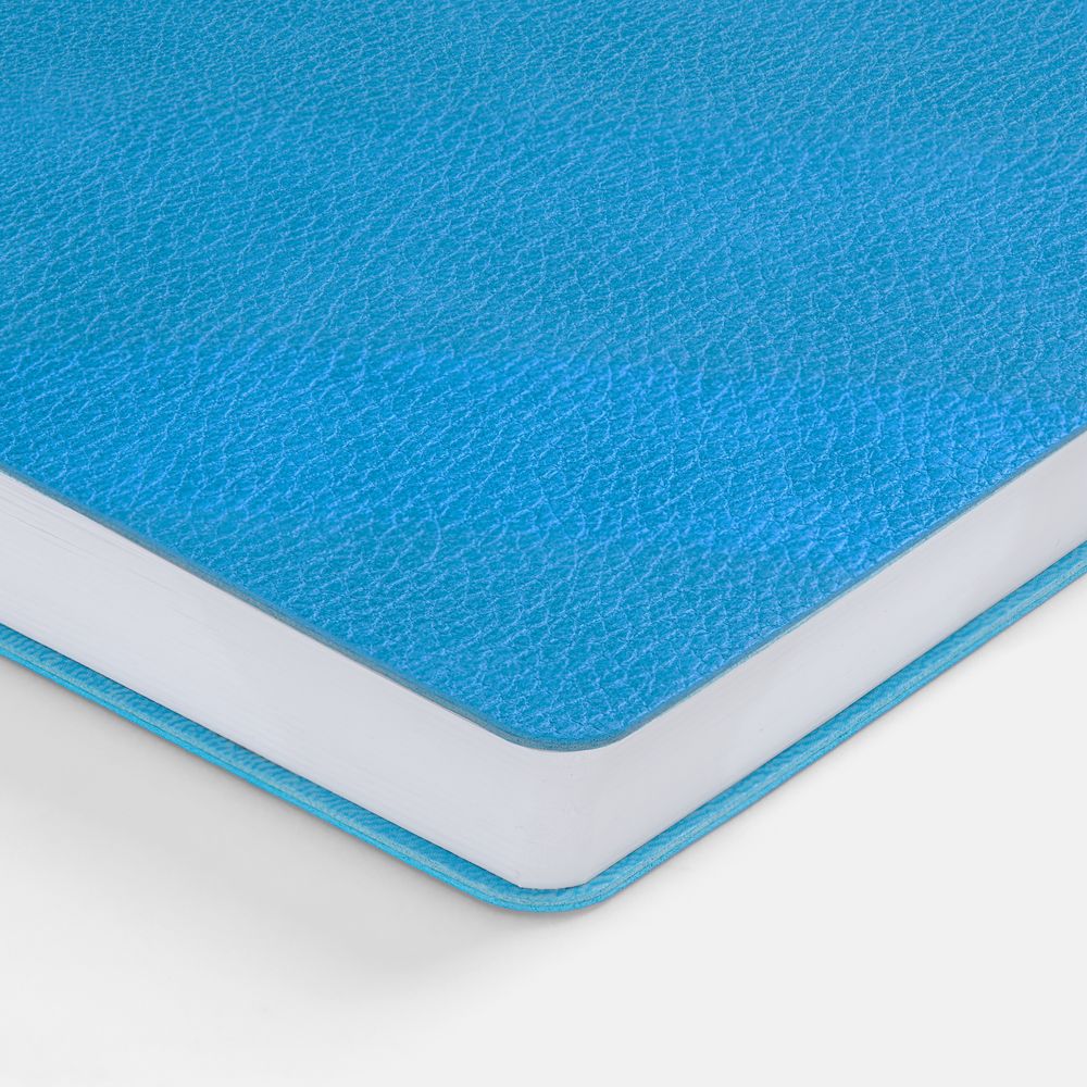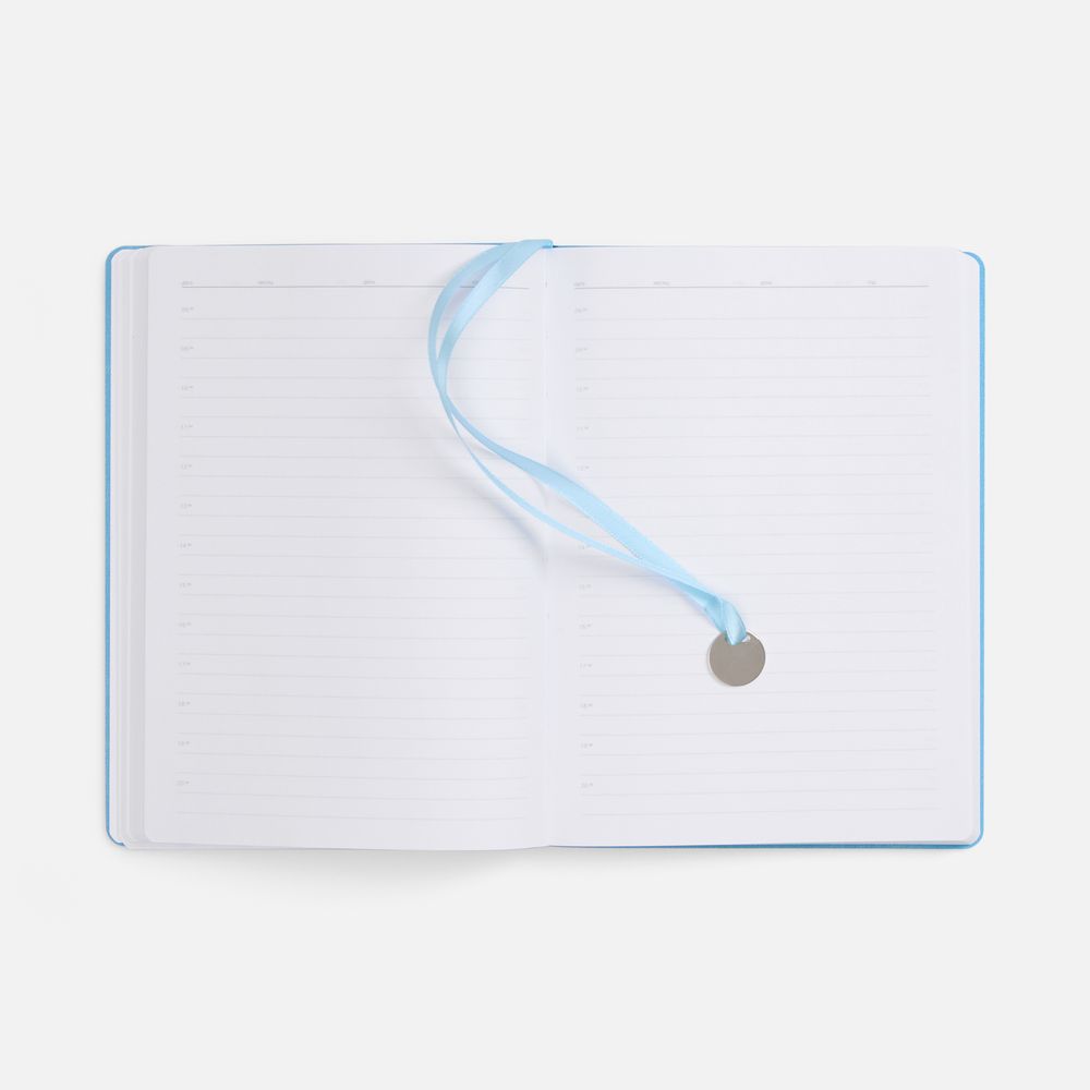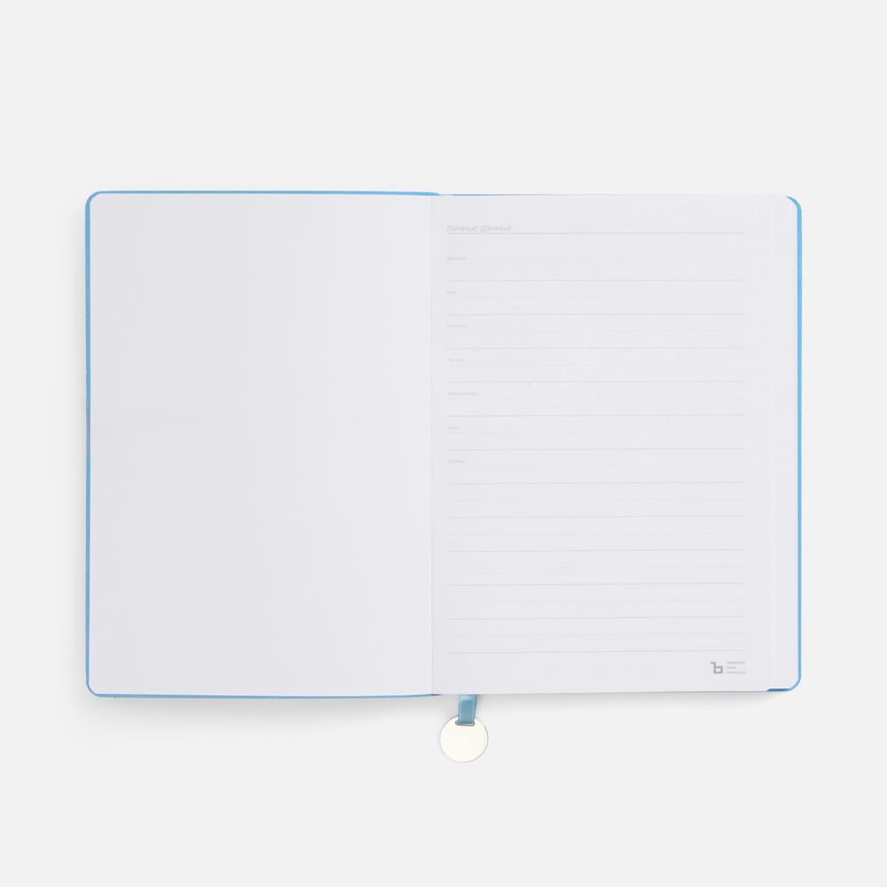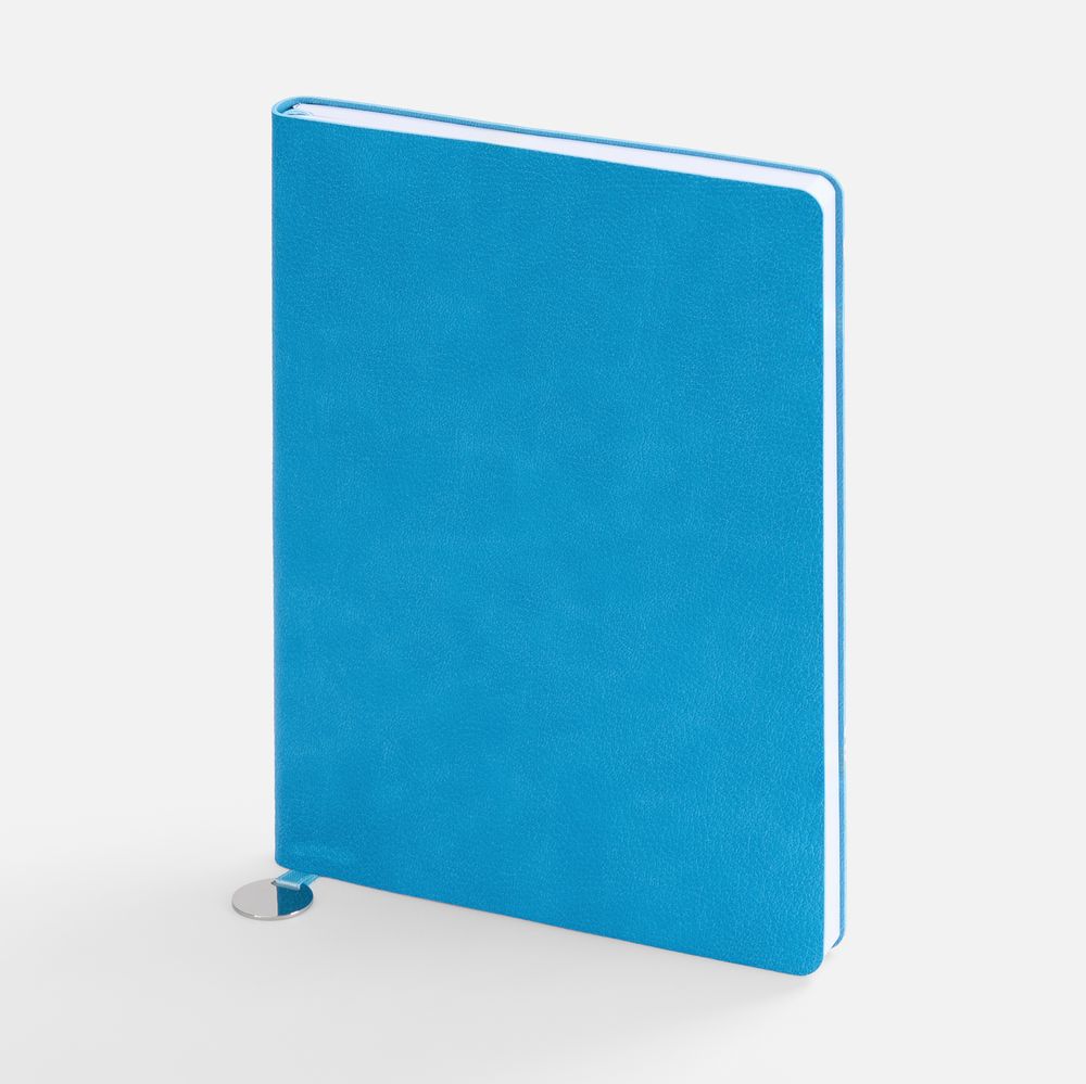 Ежедневник с гибкой обложкой, выполнен из материал La Fite, голубой JJ, дополнен ляссе в цвет обложки с металлическим шильдом.Блок 985, без календарной сетки и информационного блока:Кол-во страниц — 256;Бумага — белая, плотность 70 г/м²;Форзац и нахзац — белые.