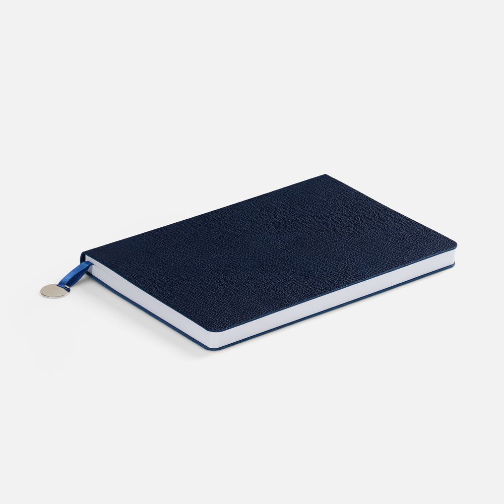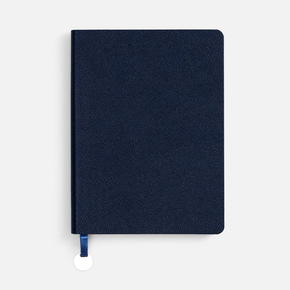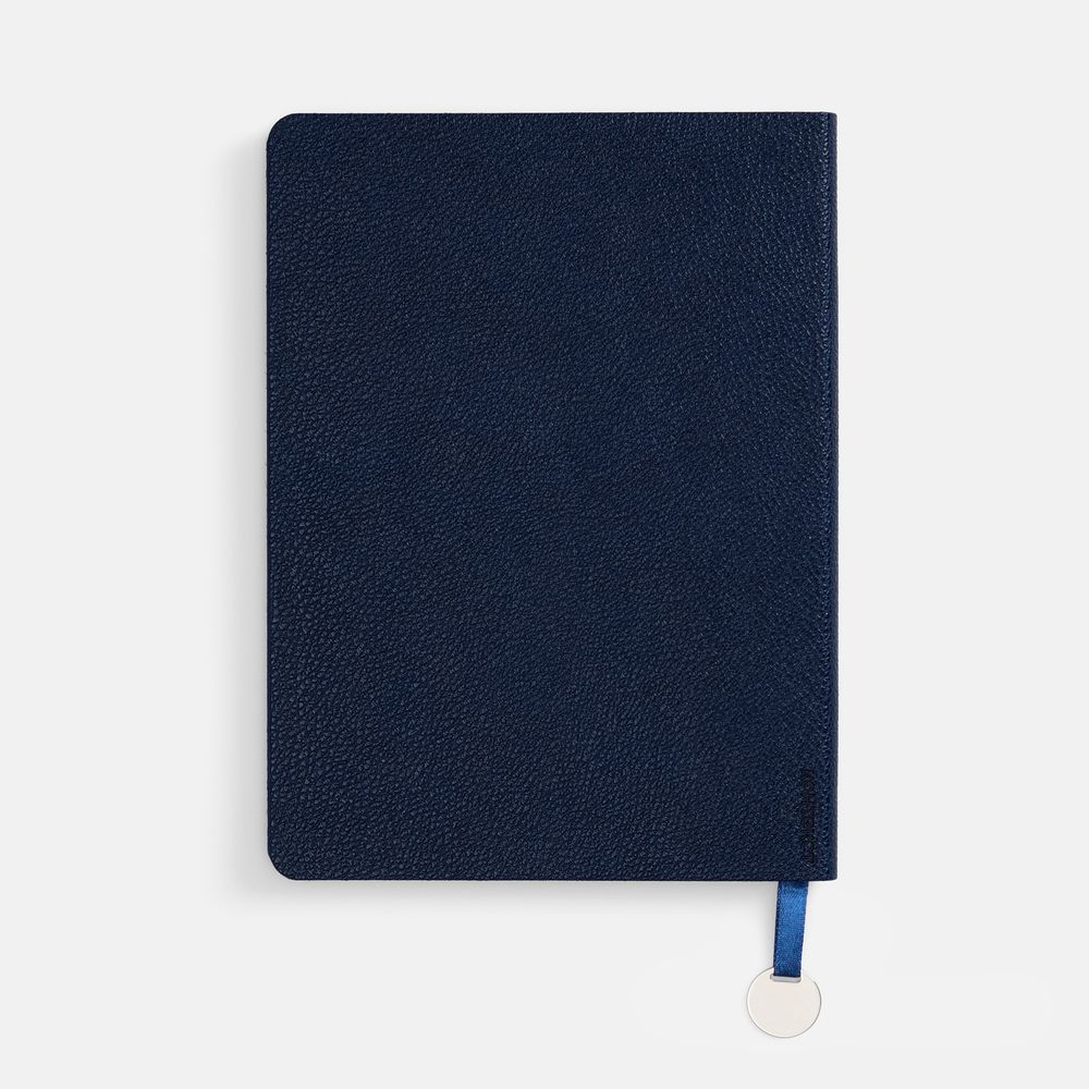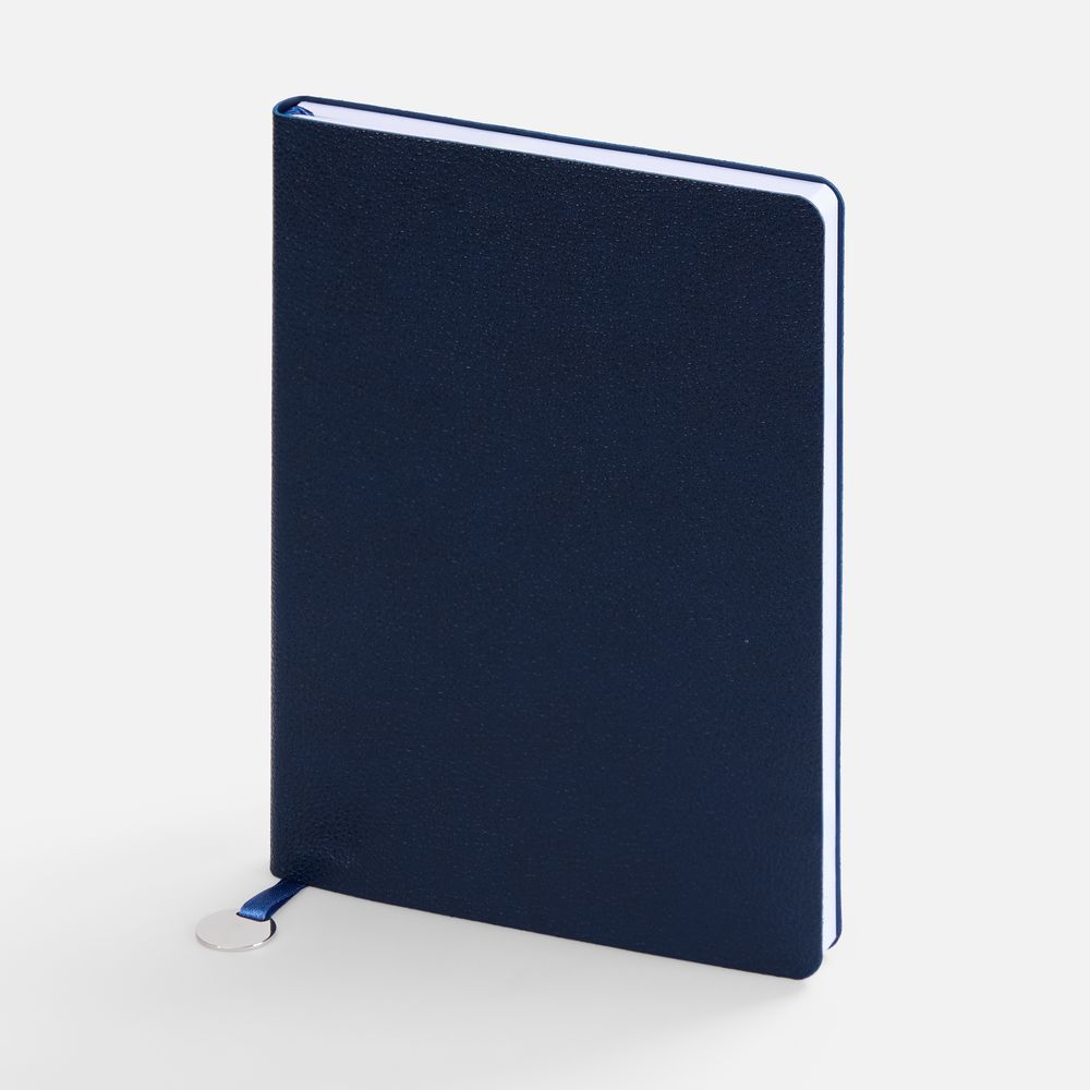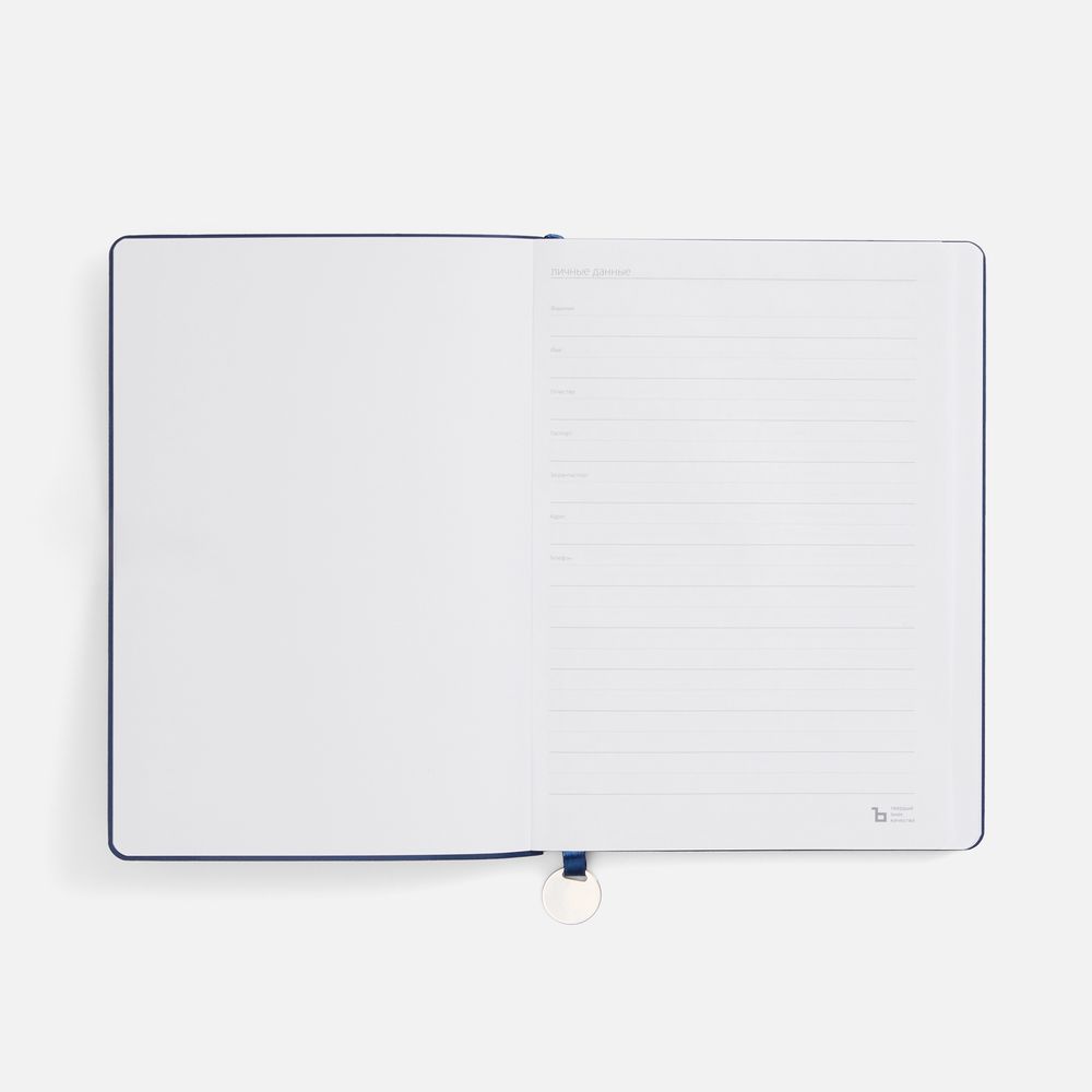 Ежедневник с гибкой обложкой, выполнен из материал La Fite, темно-синий ХХ, дополнен ляссе в цвет обложки с металлическим шильдом.Блок 985, без календарной сетки и информационного блока:Кол-во страниц — 256;Бумага — белая, плотность 70 г/м²;Форзац и нахзац — белые.