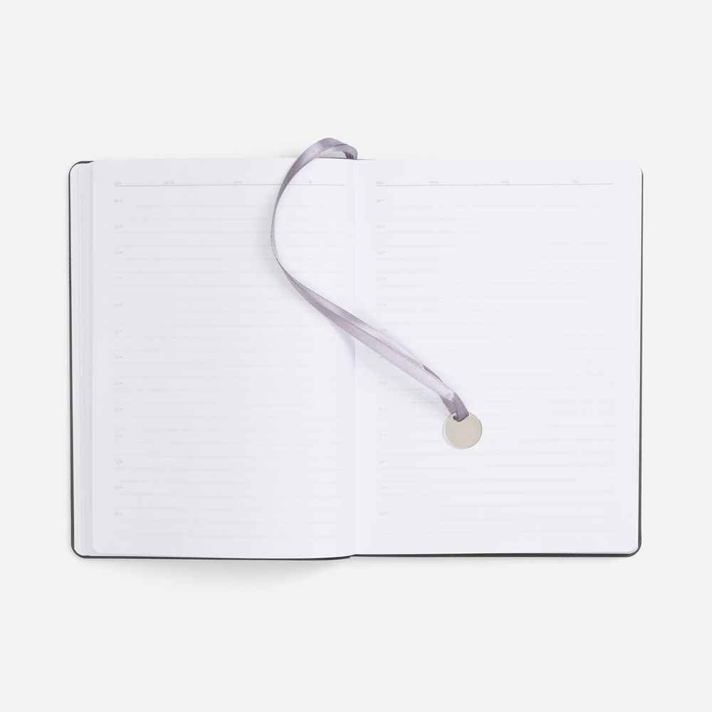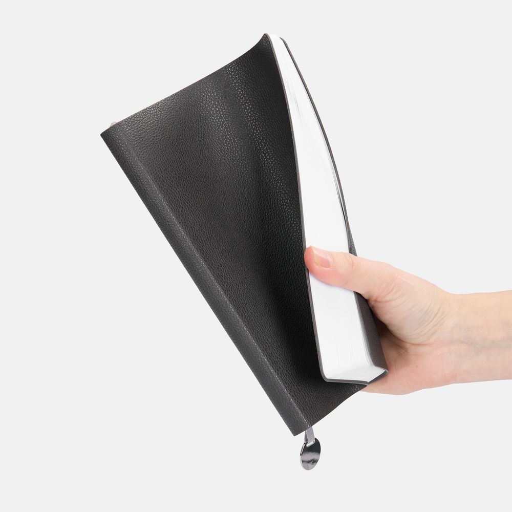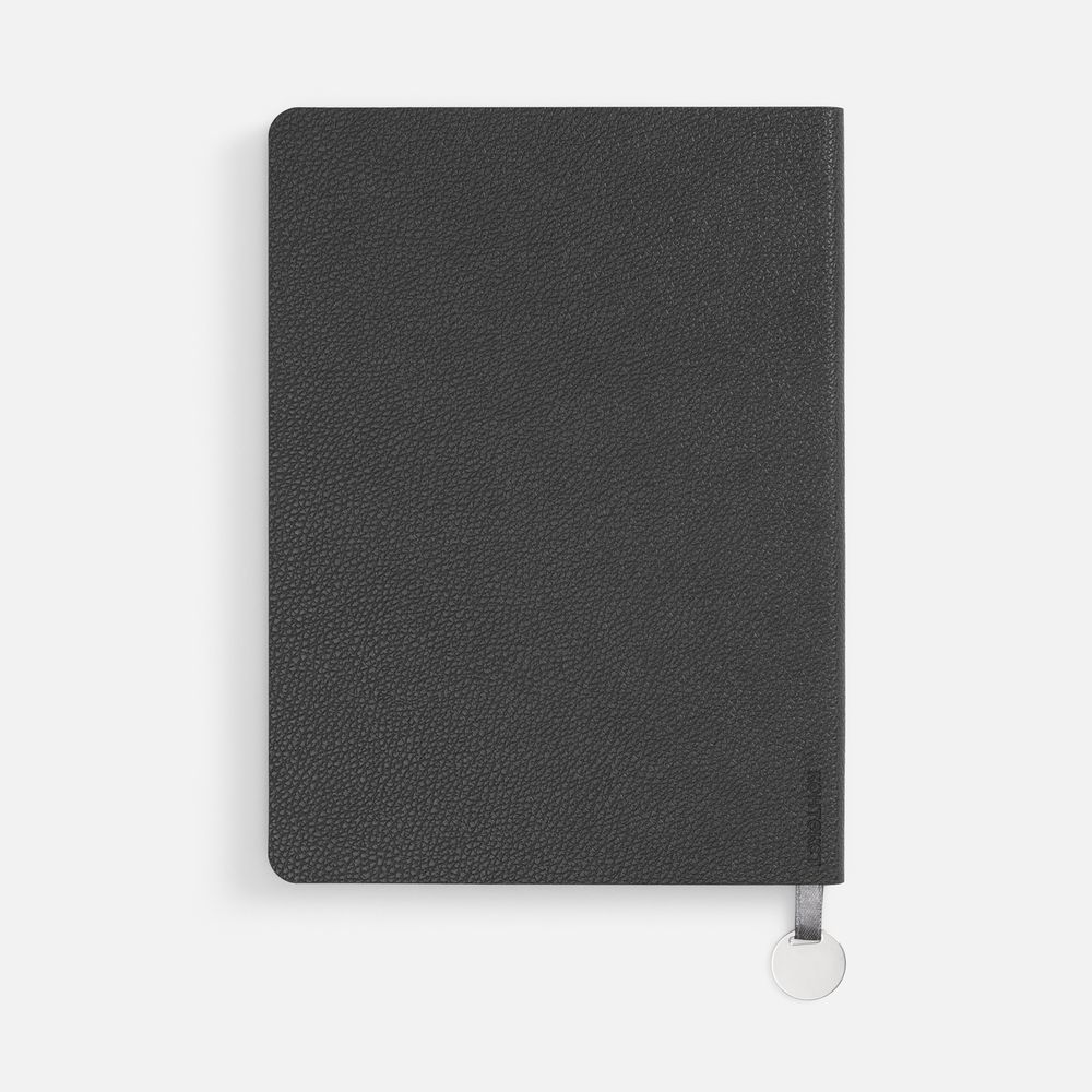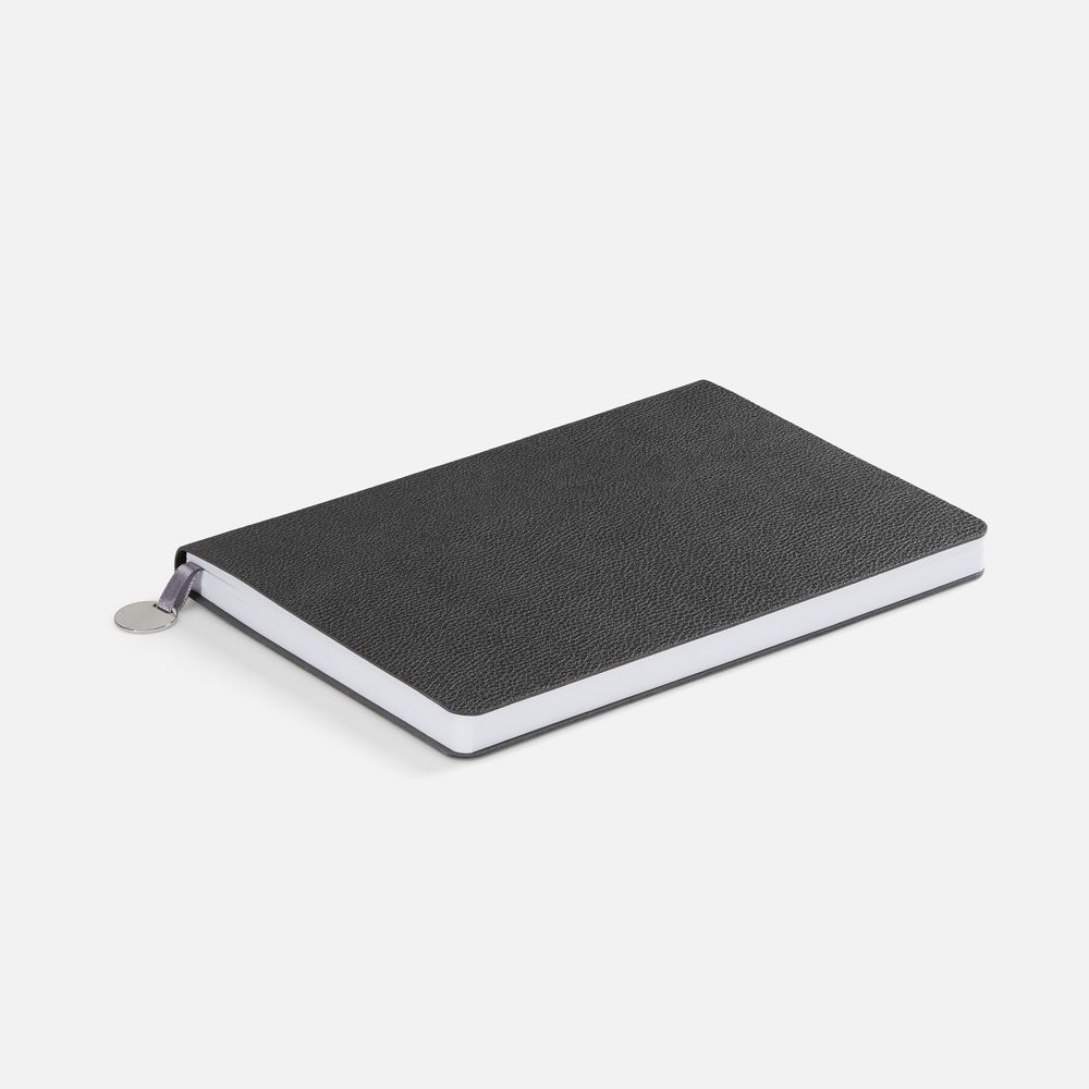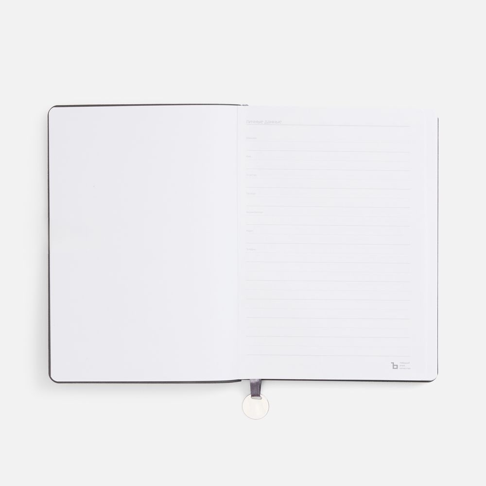 Ежедневник с гибкой обложкой, выполнен из материала La Fite, темно-серый ЕЕ, дополнен ляссе в цвет обложки с металлическим шильдом.Блок 985, без календарной сетки и информационного блока:Кол-во страниц — 256;Бумага — белая, плотность 70 г/м²;Форзац и нахзац — белые.