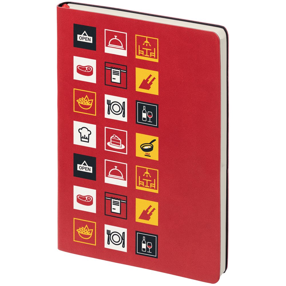 Работа в отрасли питания — это целый калейдоскоп событий и важных, трудоемких задач. Для достижения высоких результатов требуется все держать под контролем, поэтому важно всегда иметь под рукой самое необходимое. Ежедневник Industry — идеальное решение для корпоративного подарка работникам этой сферы деятельности.В каждой части общего рисунка изображены главные символы сферы питания.Ежедневник с гибкой обложкой, выполнен из материала Latte, красный, дополнен ляссе в цвет обложки.Блок недатированный, без календарной сетки:Кол-во страниц — 256;Бумага — белая, плотность 70 г/м²;Форзац и нахзац — белого цвета.