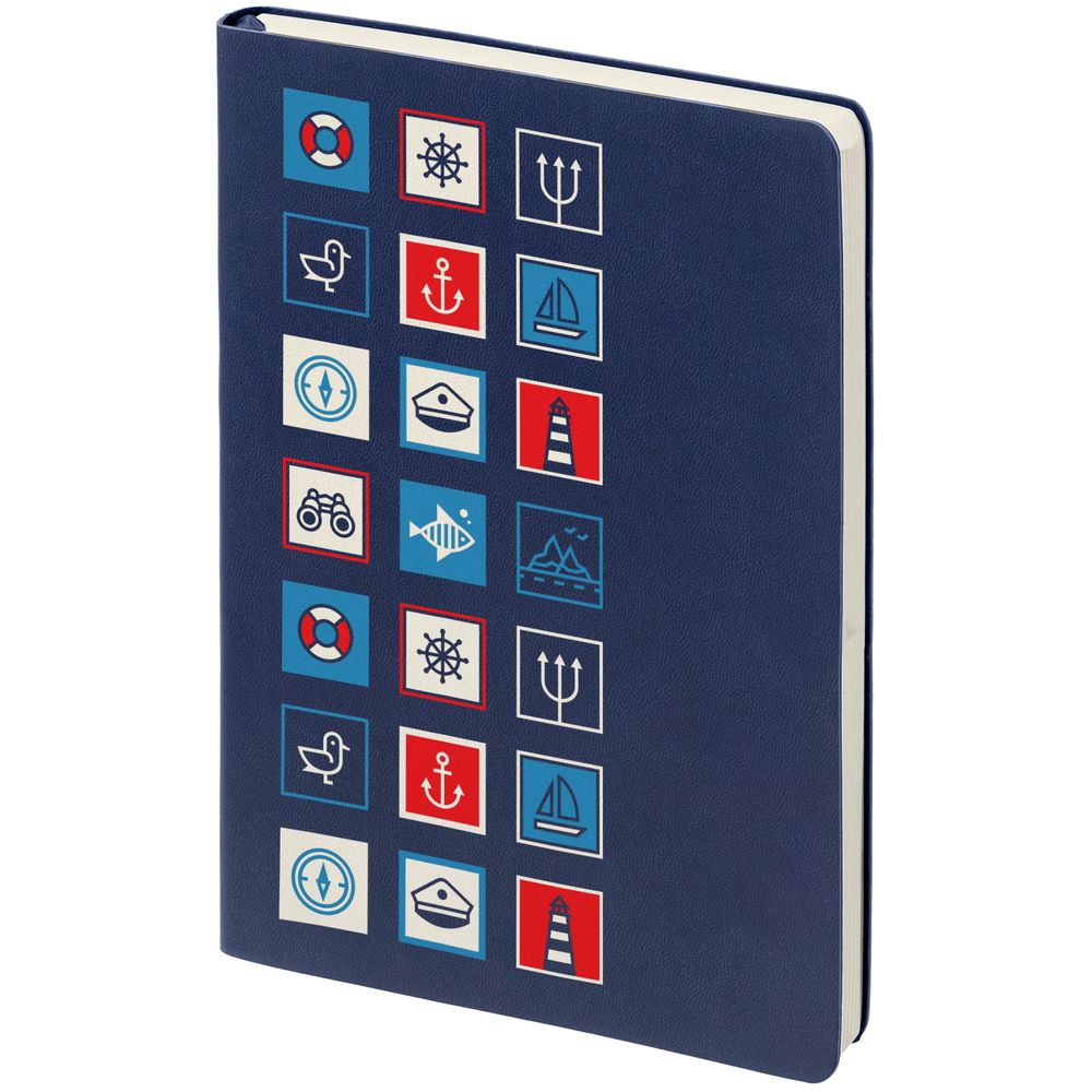 Работа в морской отрасли — это целый калейдоскоп событий и важных, трудоемких задач. Для достижения высоких результатов требуется все держать под контролем, поэтому важно всегда иметь под рукой самое необходимое. Ежедневник Industry — идеальное решение для корпоративного подарка работникам этой сферы деятельности.В каждой части общего рисунка изображены главные морские символы.Ежедневник с гибкой обложкой, выполнен из материала Latte, темно-синий, дополнен ляссе в цвет обложки.Блок недатированный, без календарной сетки:Кол-во страниц — 256;Бумага — белая, плотность 70 г/м²;Форзац и нахзац — белого цвета.