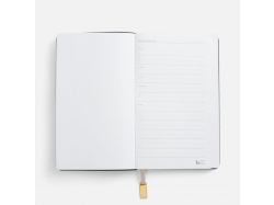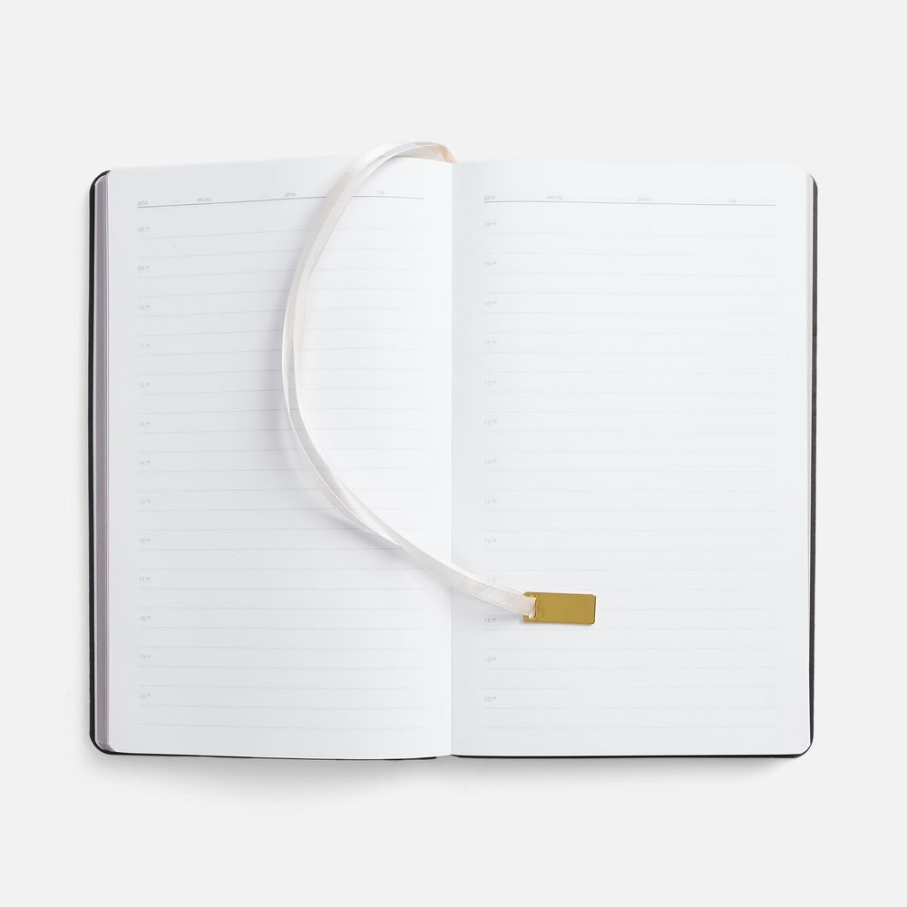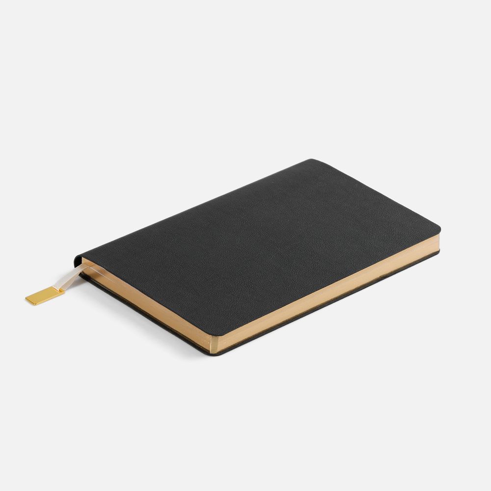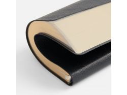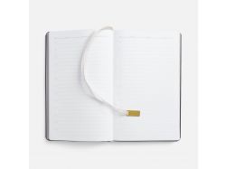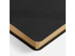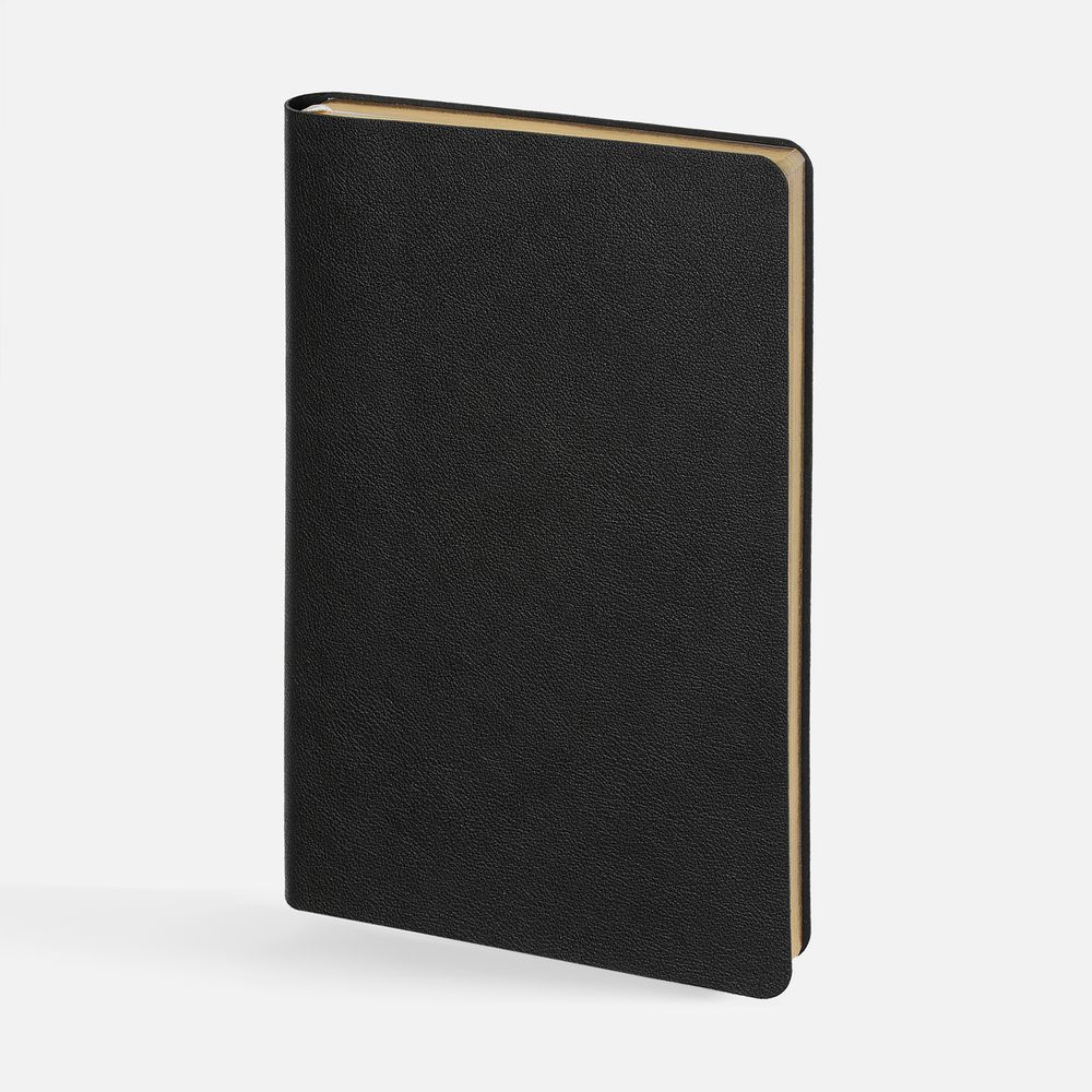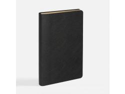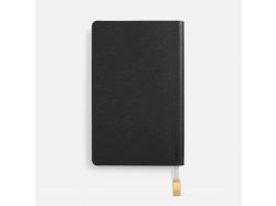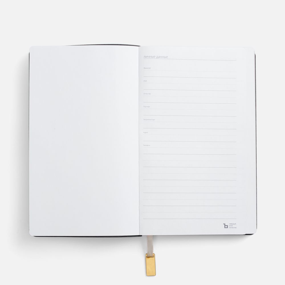 Ежедневник с гибкой обложкой, выполнен из материала Petrus, черный АА, дополнен серым ляссе с металлическим золотистым шильдиком.Блок 951, без календарной сетки и информационного блока:Кол-во страниц — 256;Бумага — белая, плотность 70 г/м²;Форзац и нахзац — белыеОбрез блока —  золотистый.