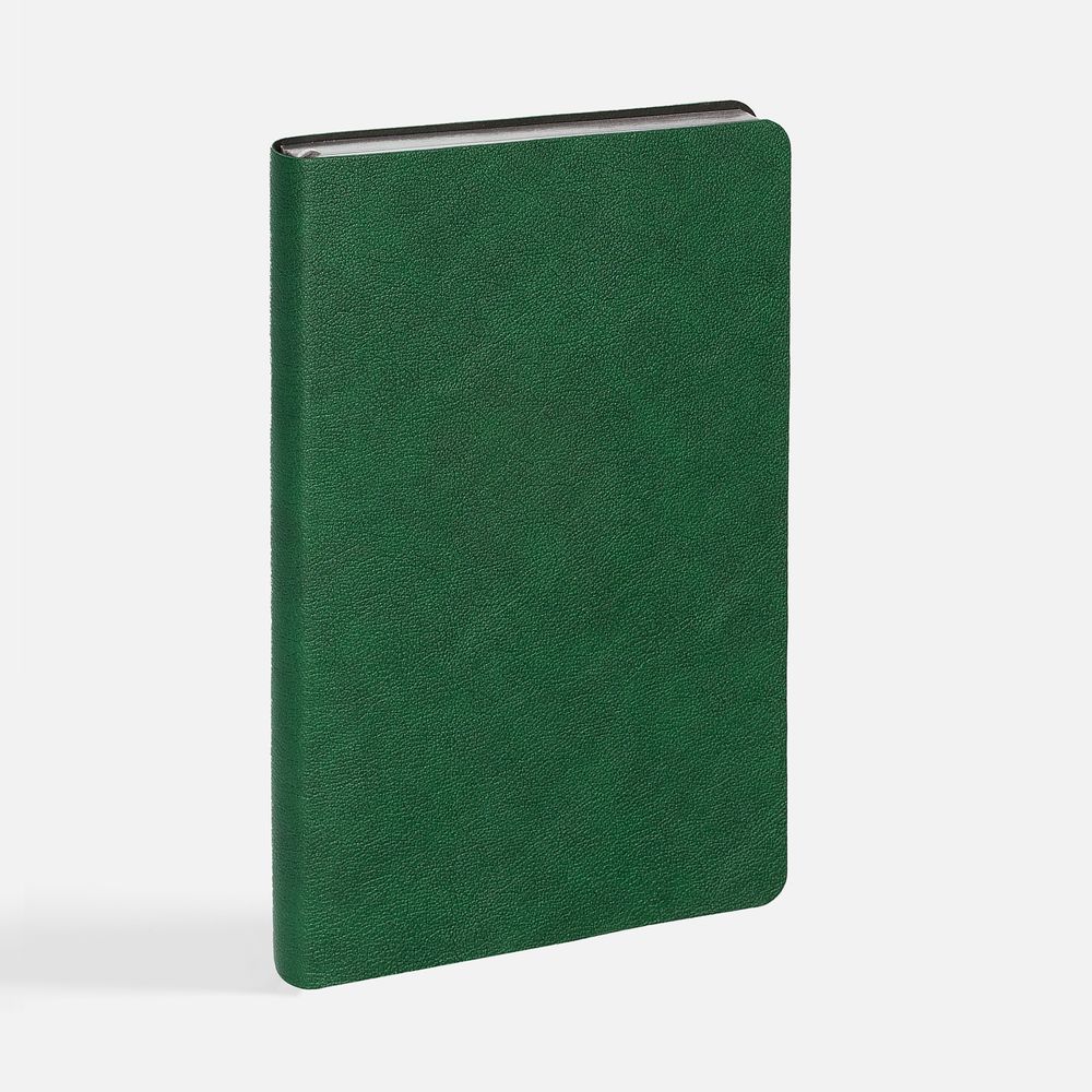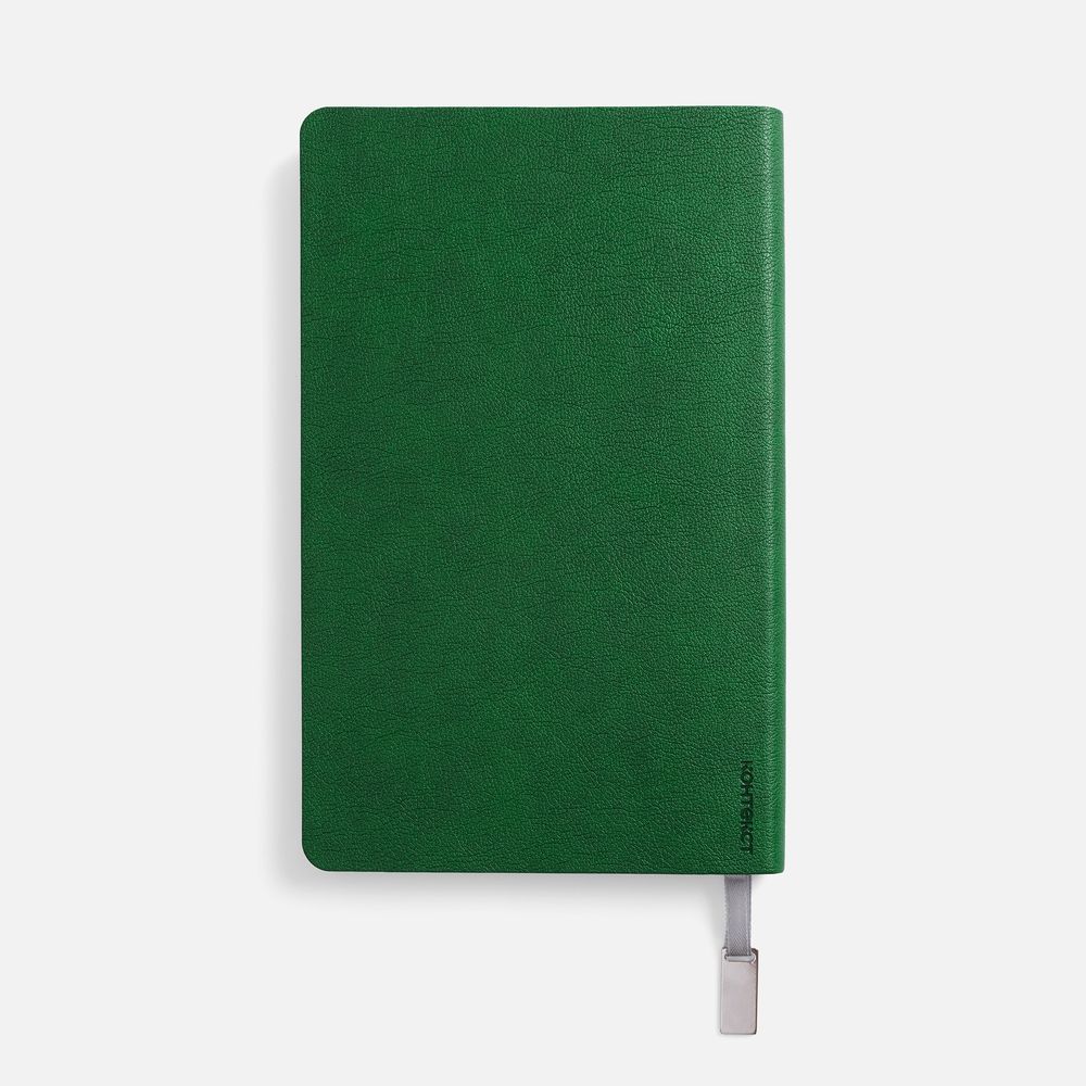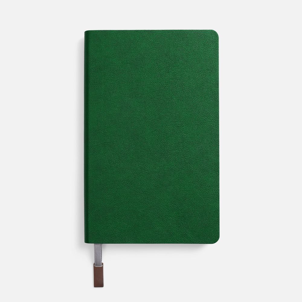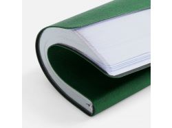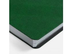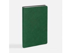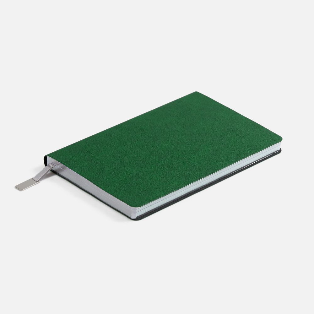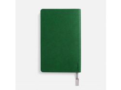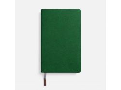 Ежедневник с гибкой обложкой, выполнен из материала Petrus, зеленый FF, дополнен серым ляссе с металлическим шильдиком.Блок 951, без календарной сетки и информационного блока:Кол-во страниц — 256;Бумага — белая, плотность 70 г/м²;Форзац и нахзац — белыеОбрез блока — серебристый.