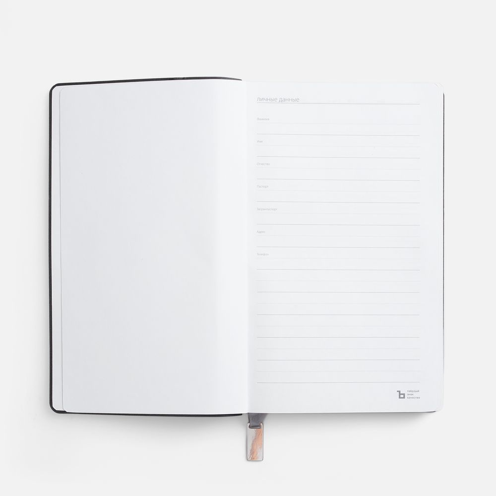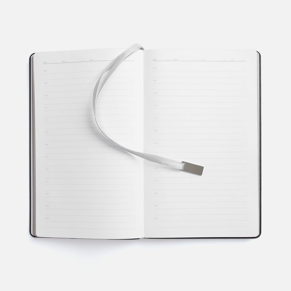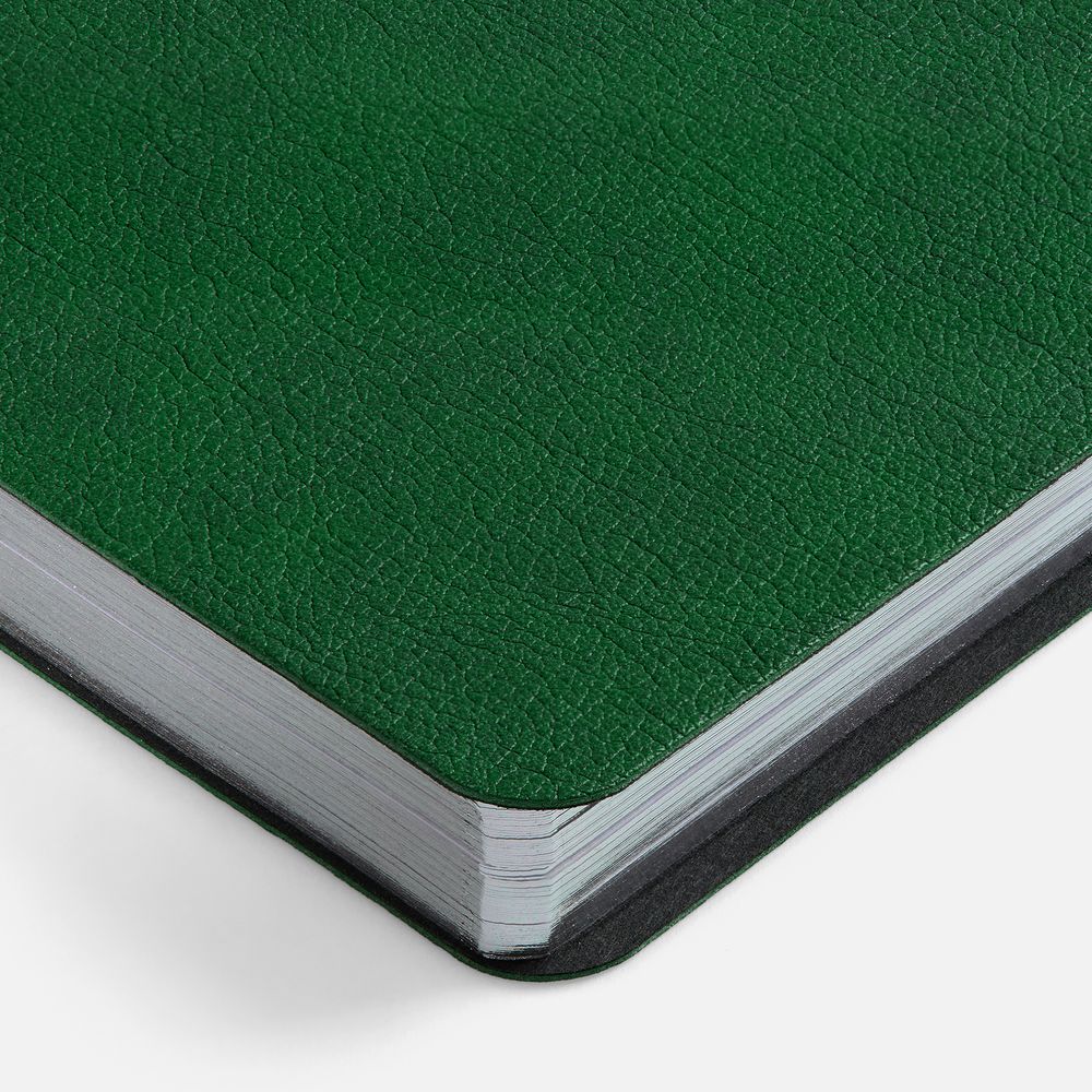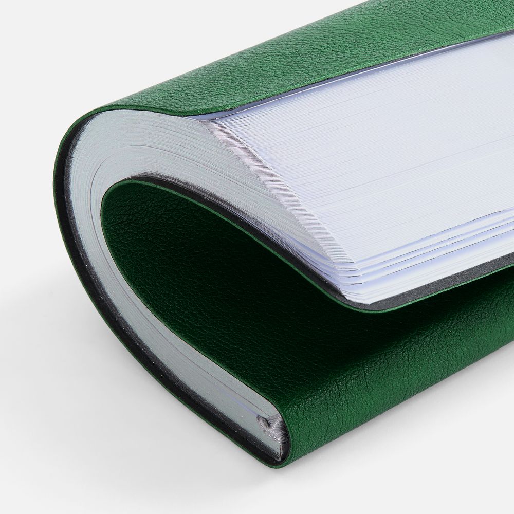 Ежедневник с гибкой обложкой, выполнен из материала Petrus, зеленый FF, дополнен серым ляссе с металлическим шильдиком.Блок 951, без календарной сетки и информационного блока:Кол-во страниц — 256;Бумага — белая, плотность 70 г/м²;Форзац и нахзац — белыеОбрез блока — серебристый.
