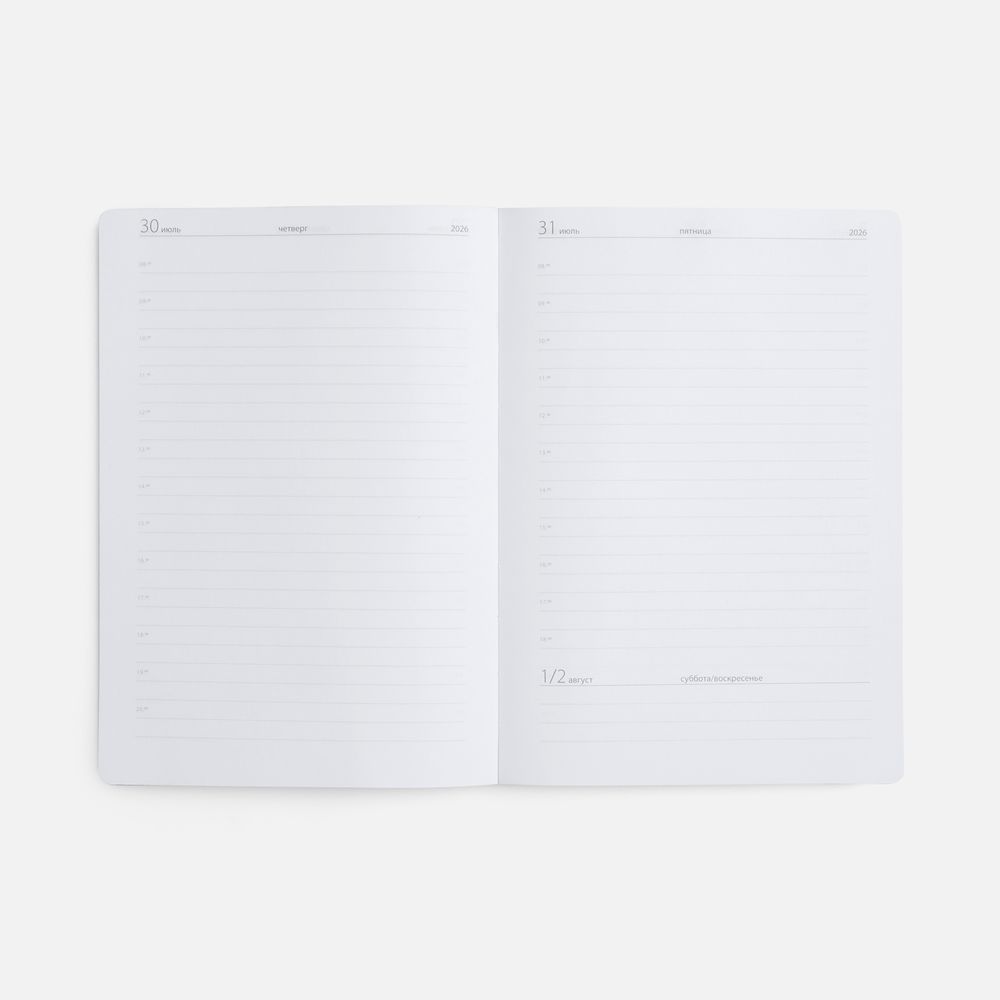 Ежедневник с твердой обложкой выполнен из материала Nice Touch, фиолетовый UU, и дополнен резинкой шириной 1 см и ляссе сиреневого цвета.Блок 256, датирован на 2026 год, без информационного блока:Кол-во страниц — 256;Бумага — белая, плотность 70 г/м²;Форзац и нахзац — белого цвета.