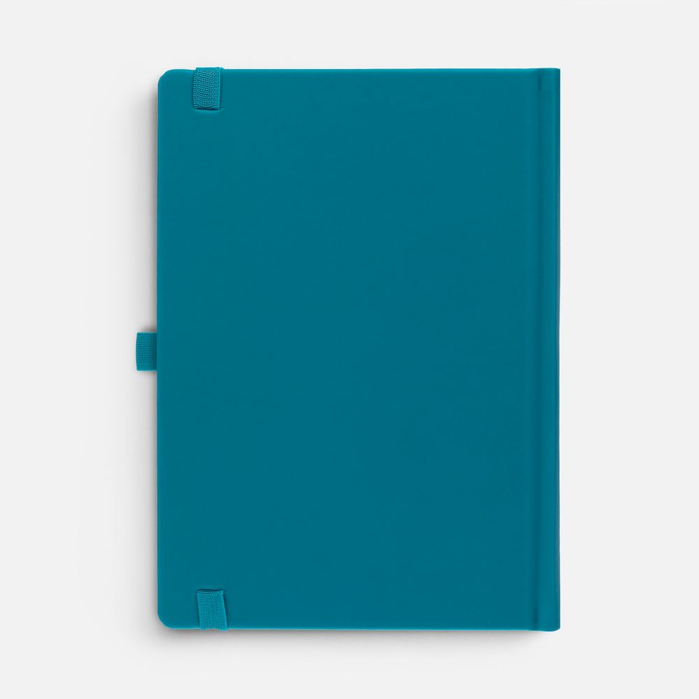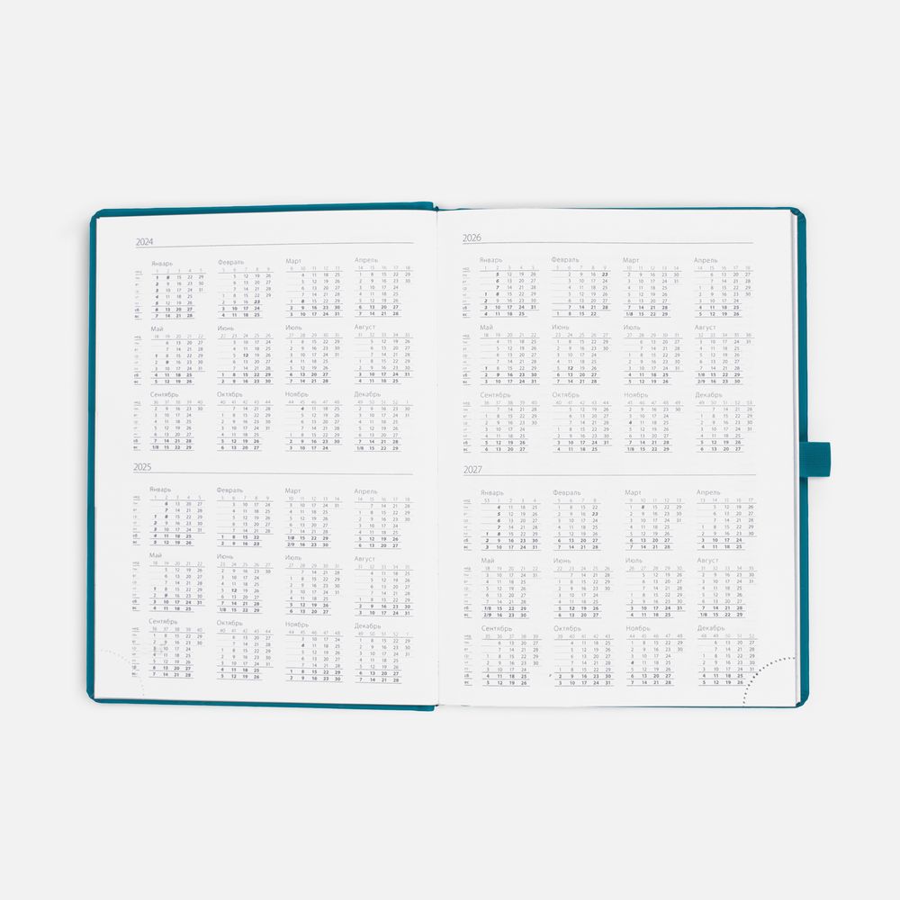 Ежедневник с твердой обложкой без поролона, выполнен из материала Soft Touch, цвет морской волны II, дополнен резинкой шириной 1 см, петлей-резинкой для ручки, капталом и ляссе темно-бирюзового цвета.Блок 922, с информационным блоком:Кол-во страниц — 336;Бумага — белая, плотность 70 г/м²;Форзац и нахзац — белого цвета.