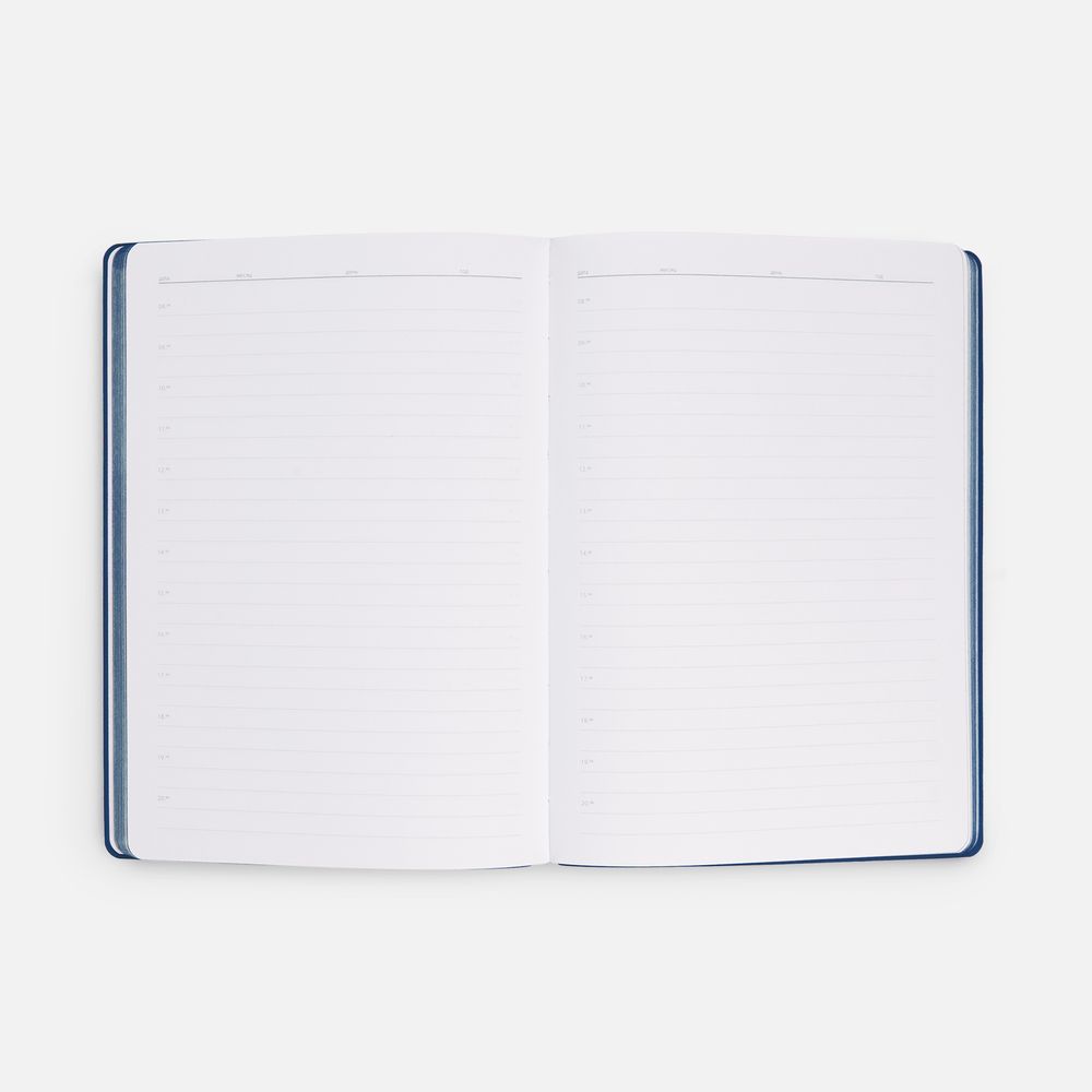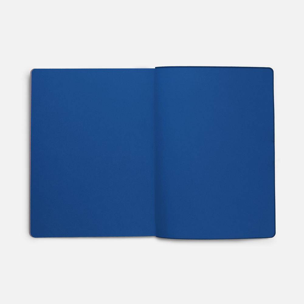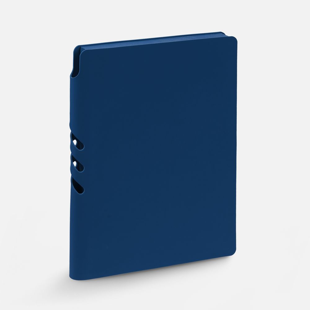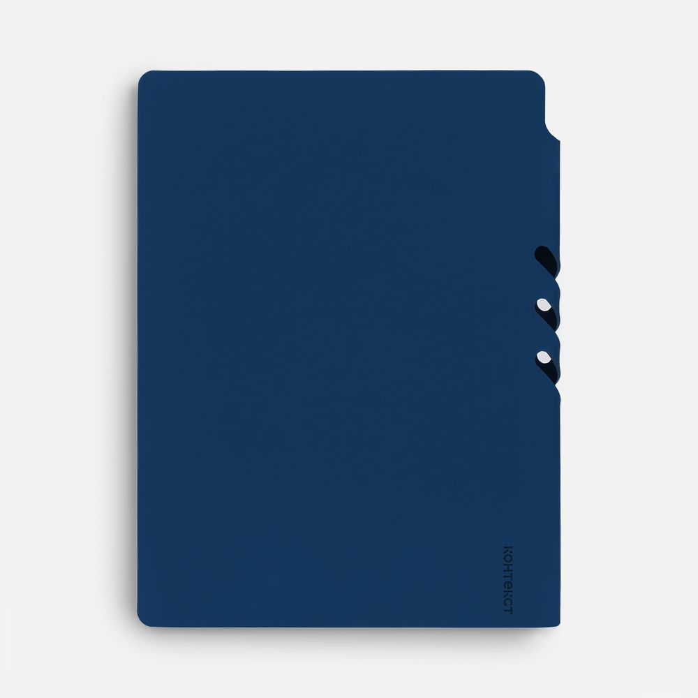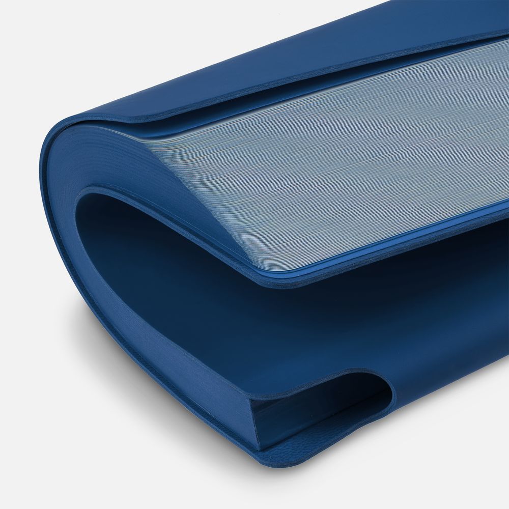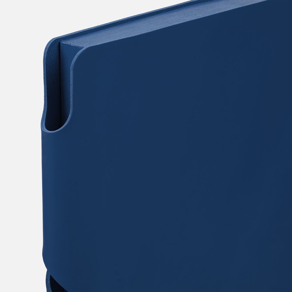 Гибкая обложка выполнена из материала Soft Touch Ultra, синий НН и Latte, синий НН (внутренняя часть обложки). Внутри корешка — специальное место для крепления ручки размером до 15х1 см.Блок 985, без информационного блока:Кол-во страниц — 256;Бумага — белая, плотность 70 г/м²;Обрез блока — синий;Форзац и нахзац — синий.