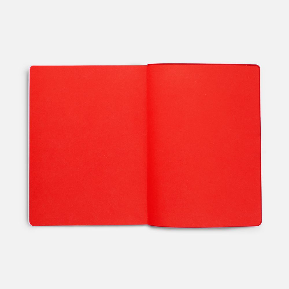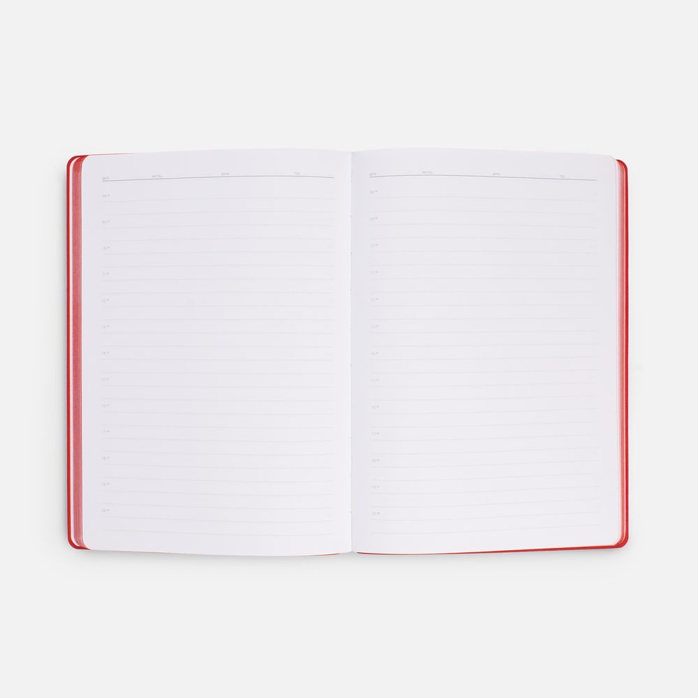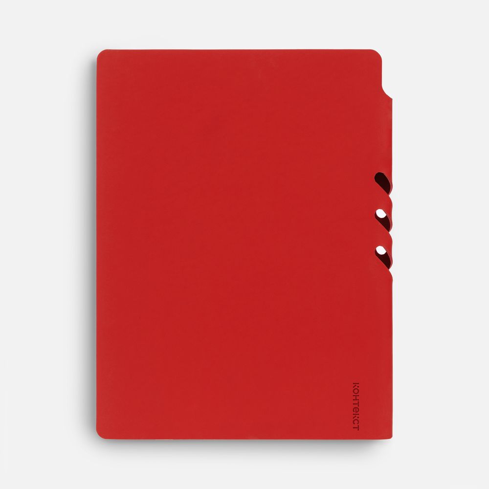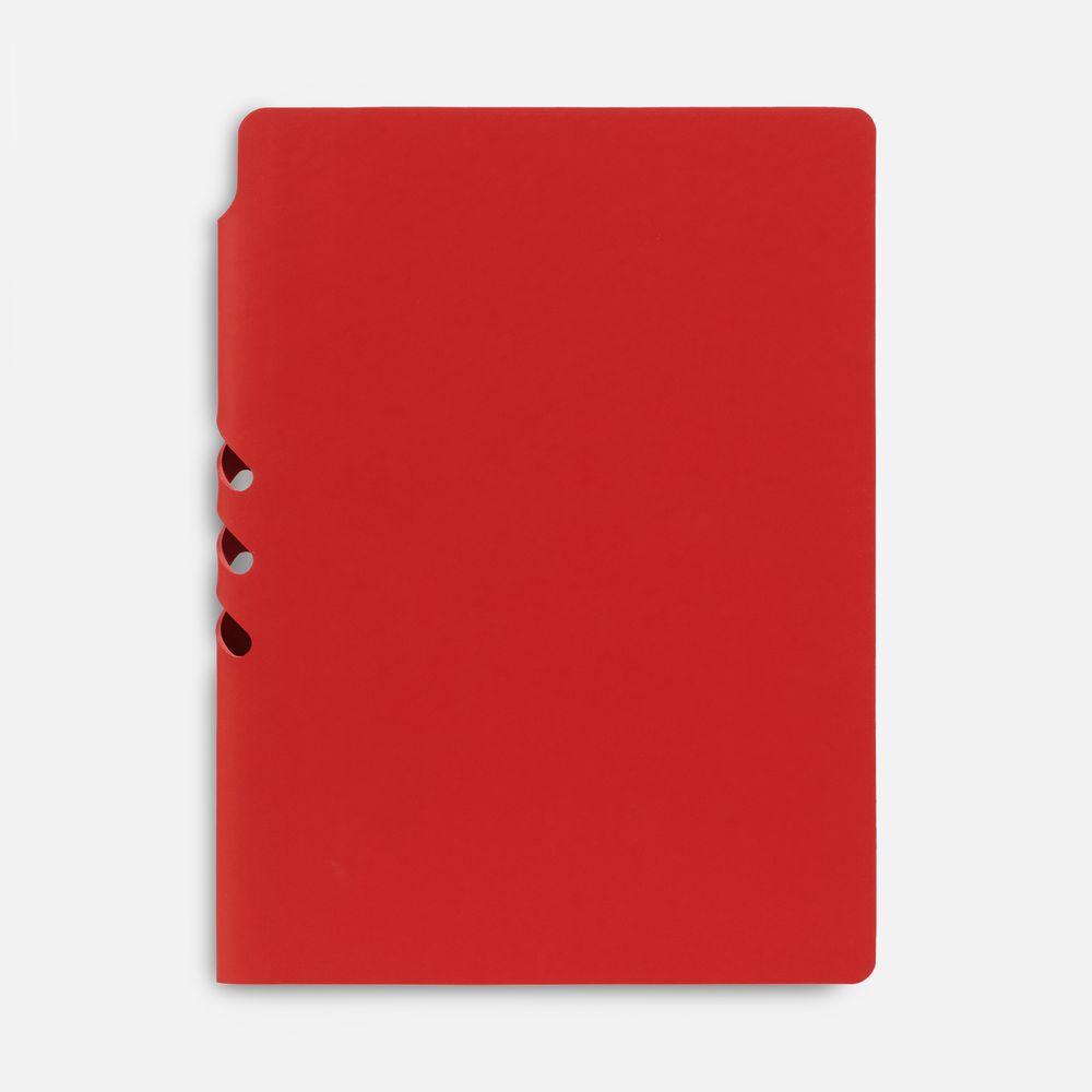 Гибкая обложка выполнена из материала Soft Touch Ultra, красный РР и Latte, красный РР (внутренняя часть обложки). Внутри корешка — специальное место для крепления ручки размером до 15х1 см.Блок 985, без информационного блока:Кол-во страниц — 256;Бумага — белая, плотность 70 г/м²;Обрез блока — красный;Форзац и нахзац — красные.