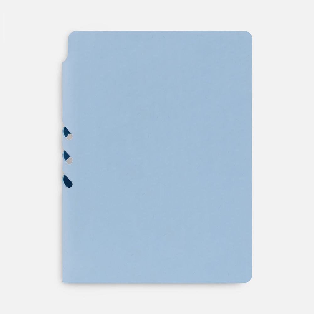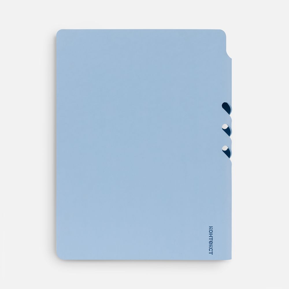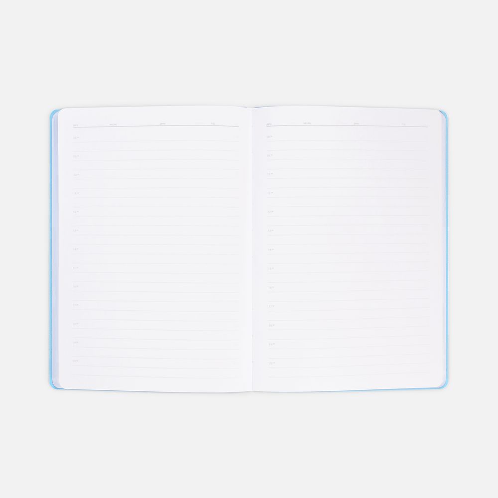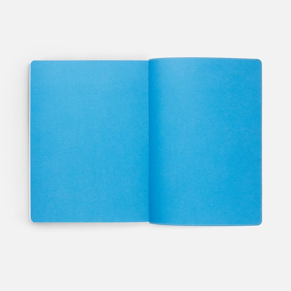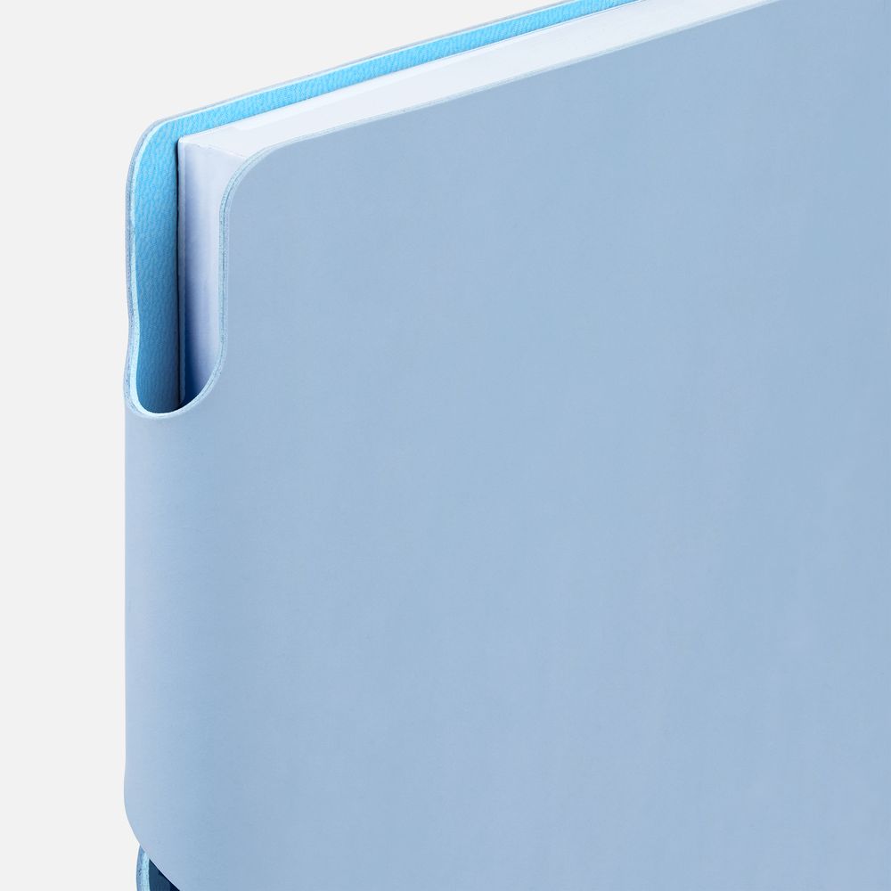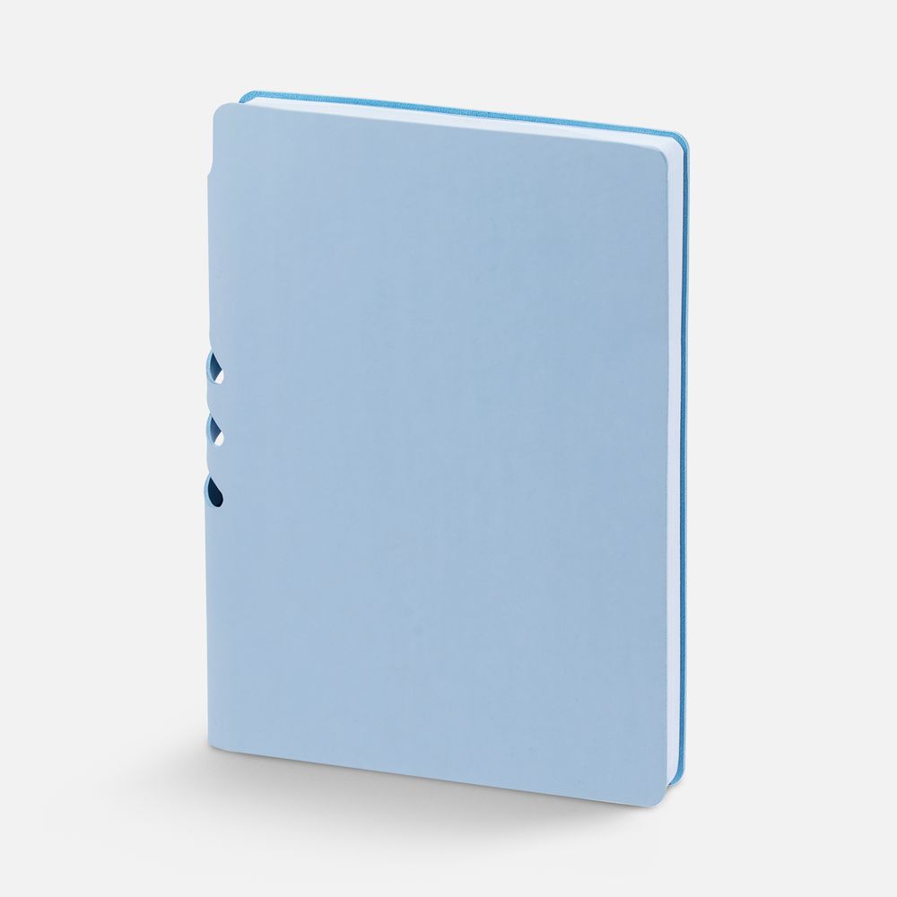 Гибкая обложка выполнена из материала Soft Touch, голубой JJ и Latte, голубой JJ (внутренняя часть обложки). Внутри корешка — специальное место для крепления ручки размером до 15х1 см.Блок 985, без информационного блока:Кол-во страниц — 256;Бумага — белая, плотность 70 г/м²;Обрез блока — голубой;Форзац и нахзац — голубой.