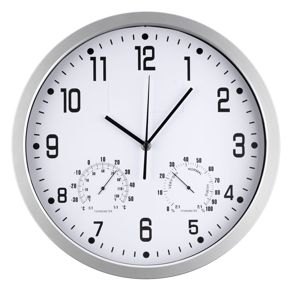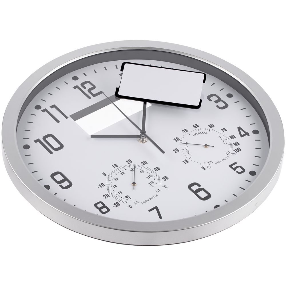 Классические настенные часы с термометром и гигрометром. В верхней части циферблата находится планка для нанесения логотипа, которая легко извлекается с тыльной стороны корпуса.Устройство работает на батарейке типа АА (1 шт.). Батарейка в комплект не входит!