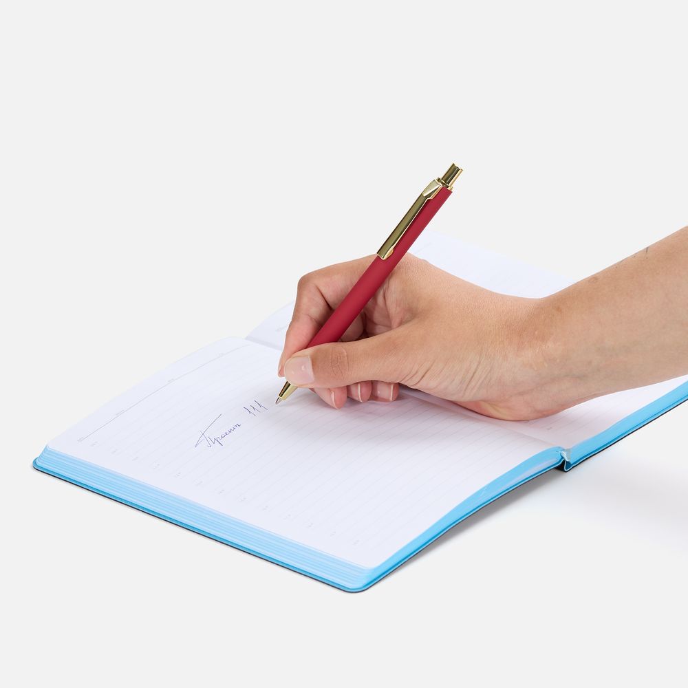 Шариковая ручка с покрытием софт-тач и золотистыми деталями. Клип оригинальной формы.Механизм ручки: нажимной.Корпус ручки разбирается, стержень легко заменить.Стержень с синими чернилами.Длина линии письма: 700 м.Поставляется в индивидуальном полиэтиленовом пакетике.Гравировка по цветным частям корпуса получается серебристой.