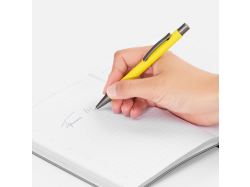 Лаконичный корпус с покрытием софт-тач и стильными матовыми деталями в приглушенном темно-сером оттенке.Механизм ручки: нажимной.Корпус ручки разбирается, стержень можно заменить.Стержень с масляными синими чернилами.Длина линии письма: 1000 м.Гравировка по цветным частям корпуса получается серебристой.