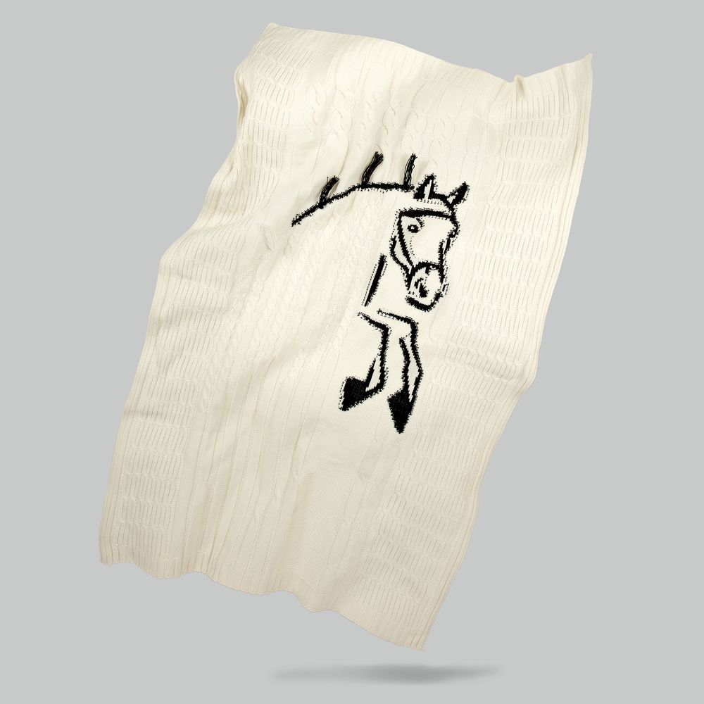 Дизайн пледа «Курбет» — интересная вариация на тему того, как лаконично, всего несколькими штрихами изобразить сразу многое, а еще с легкостью привлечь внимание, вызвав умиление и улыбку. Вдобавок этот плед уникален тем, что при его создании было мастерски использовано 5 разных техник вязания. Лошадка на пледе будто встала на дыбы с согнутыми передними ногами, то есть в стойку курбет — бойкая и игривая. Дополнительного очарования и объема добавляют ей аккуратные кисточки на гриве. Словно незаконченный карандашный рисунок или эскиз, лошадь контрастно выделяется на общем белом фоне, символизируя полную готовность к грядущему году и его вызовам. А как еще встречать Новый год, если не с радостью и бурным желанием устремиться вперед?Поставляется в пакете с липким краем.