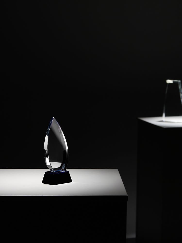 Стела изготовлена из стекла К9, в основе которого лежит оптическое боросиликатное стекло. Эту марку стекла отличает низкий процент посторонних включений, высокий показатель преломления и высокая прозрачность — идеальные качества для изготовления наград премиального уровня.Дополнительный слой синего стекла на основании придает всей стеле легкий оттенок.