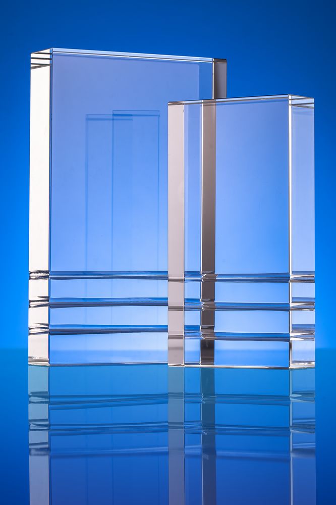 Стела изготовлена из стекла К9, в основе которого лежит оптическое боросиликатное стекло. Эту марку стекла отличает низкий процент посторонних включений, высокий показатель преломления и высокая прозрачность — идеальные качества для изготовления наград премиального уровня.