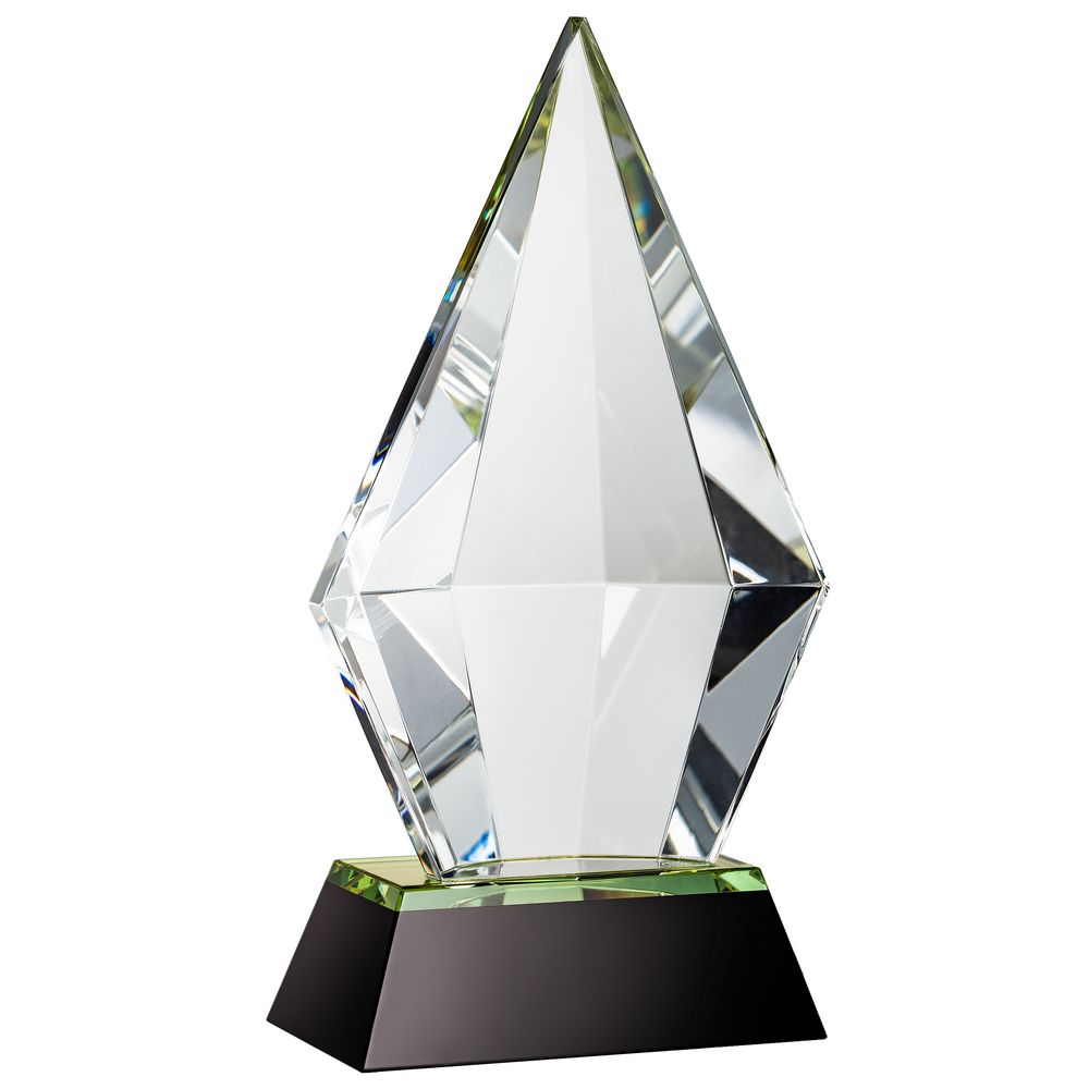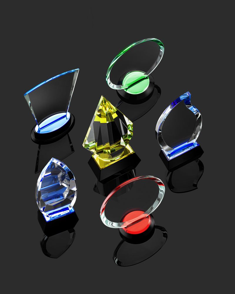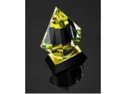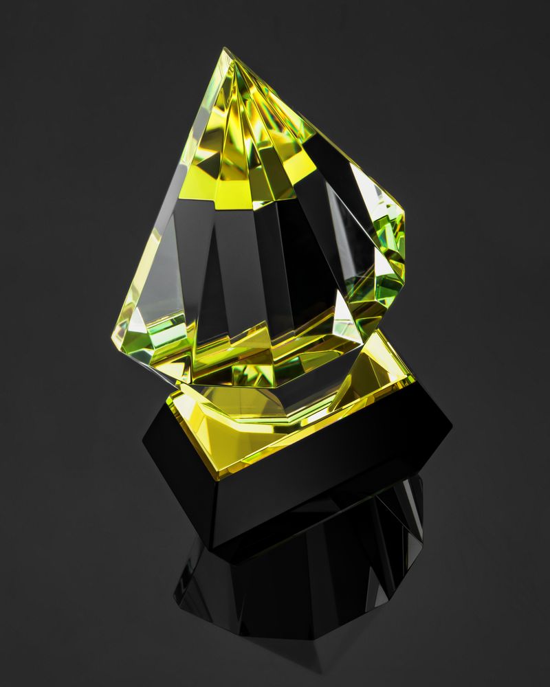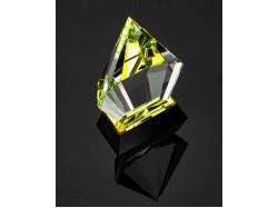 Стела изготовлена из стекла К9, в основе которого лежит оптическое боросиликатное стекло. Эту марку стекла отличает низкий процент посторонних включений, высокий показатель преломления и высокая прозрачность — идеальные качества для изготовления наград премиального уровня.Дополнительный слой желтого стекла на основании придает всей стеле легкий оттенок.
