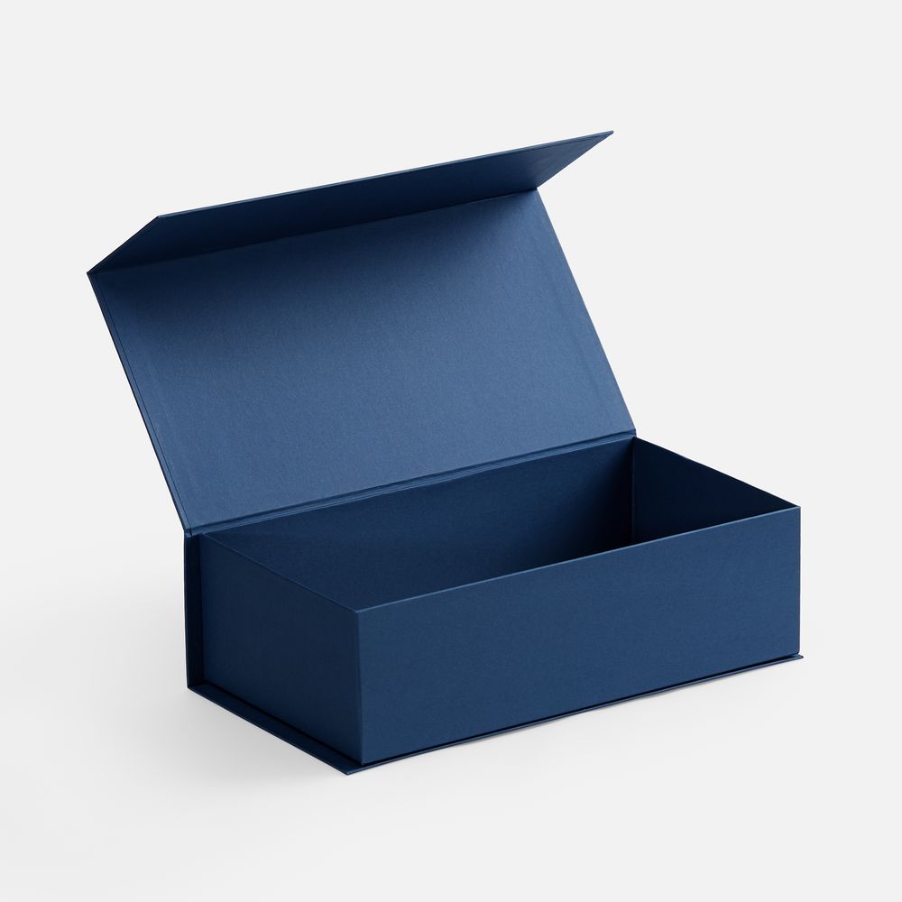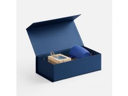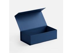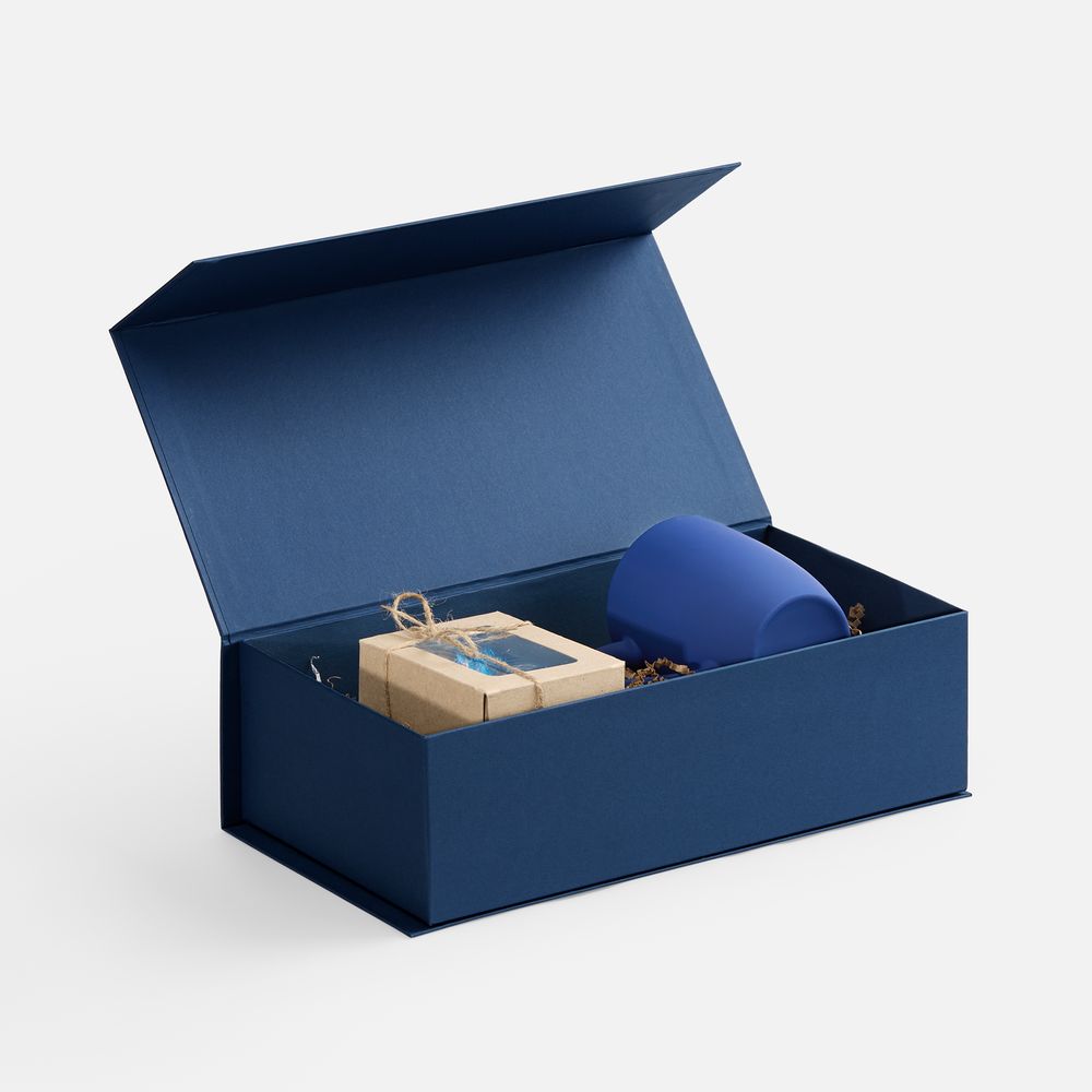Коробка изготовлена из переплетного картона, кашированного гладкой дизайнерской бумагой Malmero «Благородный синий», с крышкой на магните.Конструкция коробки предусматривает наличие технологического зазора шириной до 2 мм по линии сопряжения короба и крышки.