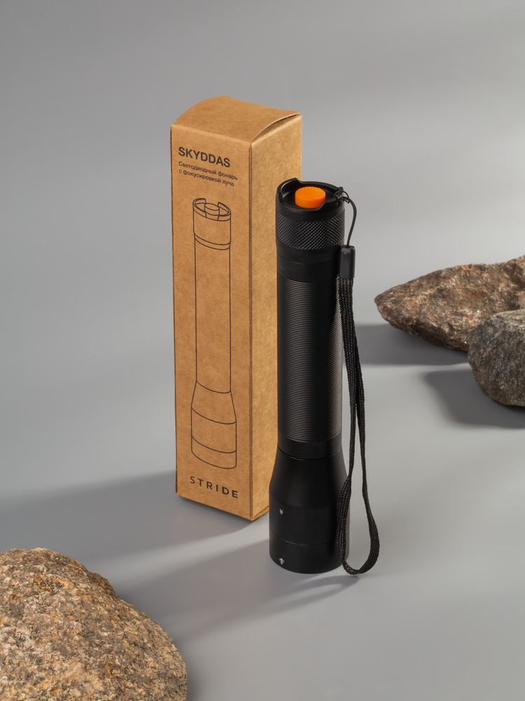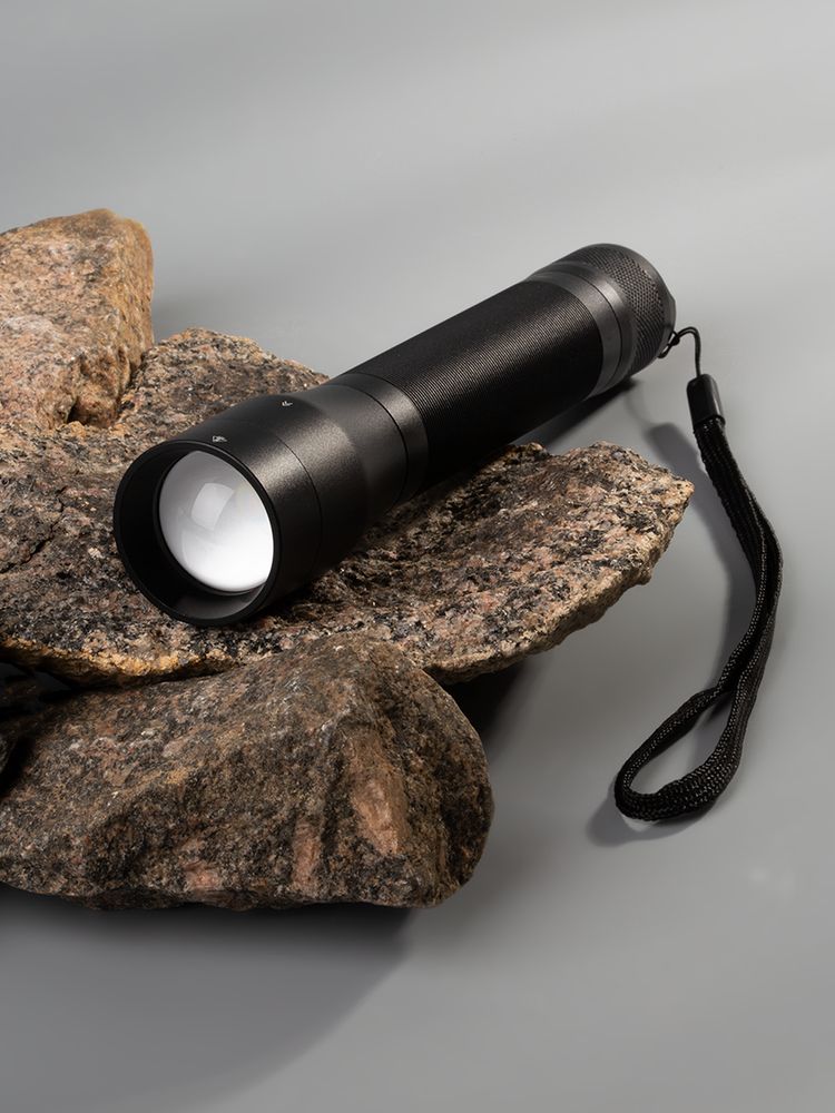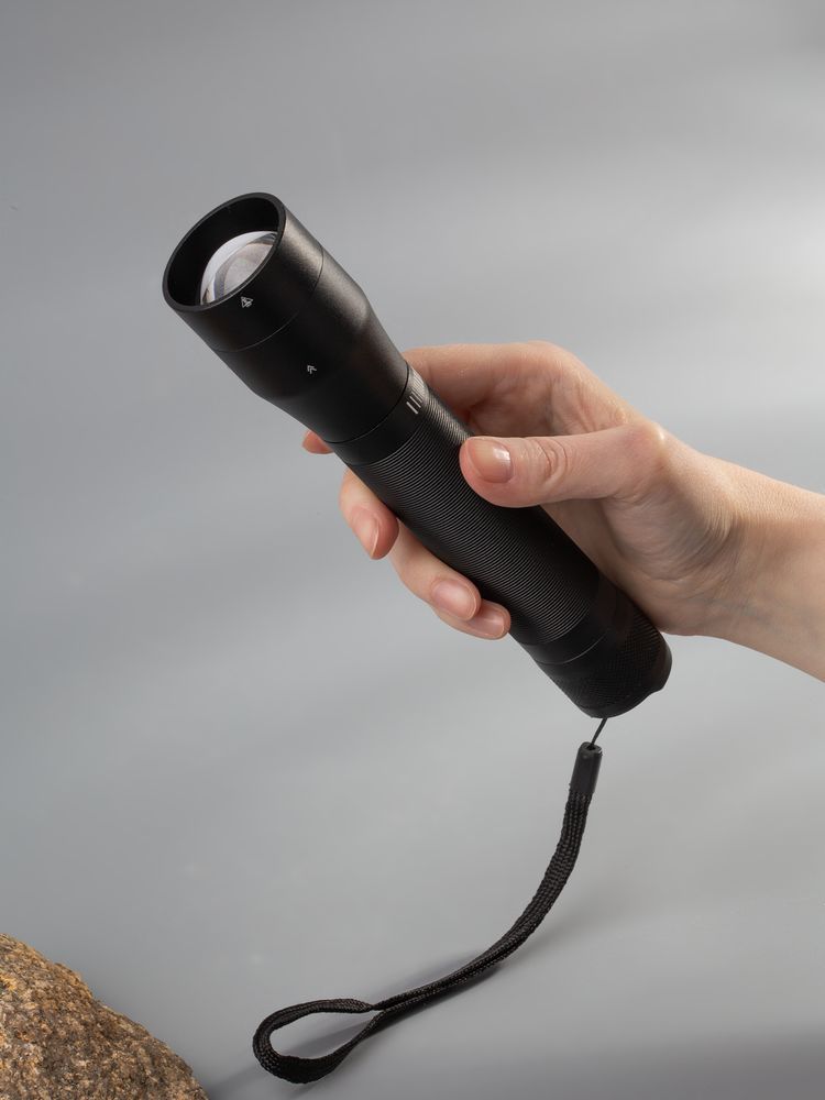 Сверхъяркий светодиод CREE XML T6;Три режима работы;Влаго- и пылезащита IP54;Фокусировка луча;Световой поток до 600 лм;Корпус из алюминия;Дальность луча до 150 м;Работает от 3 батареек LR14 (в комплект не входят).